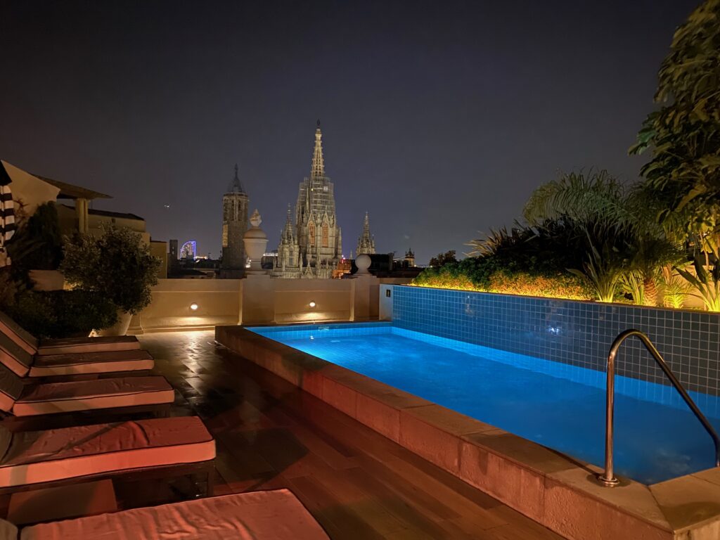 Our hotel was the H10 Madison in the Gothic Quarter of Barcelona, which stretches from the Plaça Catalunya to the Aquarium and Columbus Monument on the waterfront. On arrival we had a lovely warm welcome from Ruben, who was brought up in Tenerife and thought we were very lucky to be living in the Canary Islands. We had been given a high floor classic room as requested (709) and once unpacked we headed to the roof top on floor 8 to see the pool bar and terrace which is exclusive for hotel guests with panoramic views of the cathedral and city.