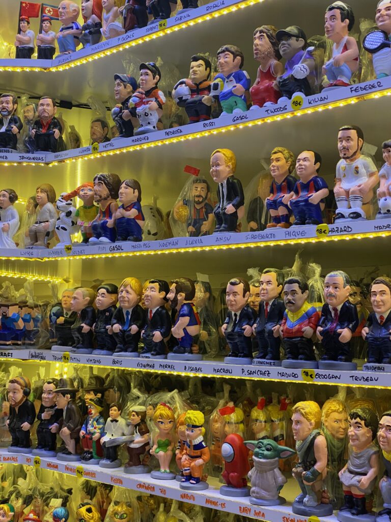 After a welcome house cocktail of gin fizz, we took a short walk (200m) to the Fira de Santa Llúcia Christmas market. This was the last night and stalls mainly consisted of nativity models to create your own scene at home. On our to do list was to buy a Caganer, the cheeky character that can be found having a poo in the Belén nativity scenes in Spain. The Caganer stalls had lots of famous characters caught with their trousers down, there were some UK references including Boris and a Queen’s Guard. We purchased a traditional Catalan figure in the end. These nativity scenes are known as Pessebres de Nadal in Catalunya. We needed to show our Covid Pass before being welcomed into the Italian restaurant La Perla Nera for traditional pizzas cooked in a wood fired oven.