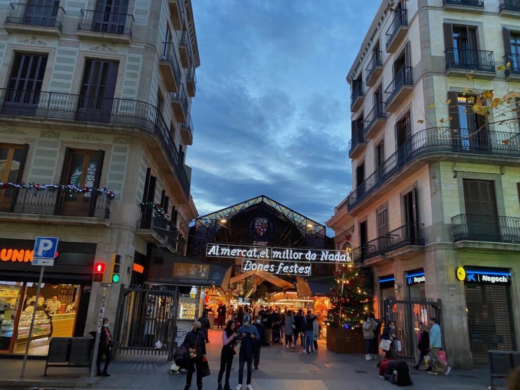 For our first full day we caught up with work first before brunch at Citizen Cafe (500m from our hotel). We wandered around the Plaça Catalunya which is a main shopping area and busy with last minute shoppers on Christmas Eve. Next we walked along Gran Via to find La Feria de Reyes, this Christmas market is focussed on traditional toys and gifts. We found the Carbon de Azúcar traditional sweets here, plus more poop, this time in the candy form! We walked along some lovely narrower streets in the Gothic Quarter to the Mercat Santa Caterina, recommended by some local foodies as a better alternative to the Mercat de Sant Josep de la Boqueria.