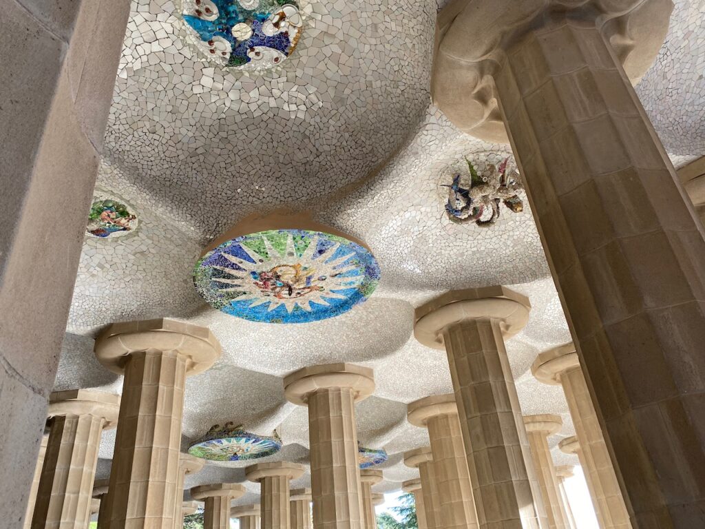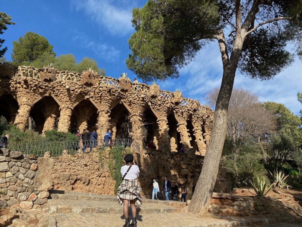 It was a gorgeous day, with a wispy blue sky and warm sunshine. To get there we used the metro, it’s €2.40 for a single trip and saved us walking 4km. Alternatively you can purchase a T-casual card at €11.35 for 10 trips. It’s an uphill walk from the metro at Lesseps on the L3 line, we’d booked in advance so walked straight into the park on arrival. Wow! What a fabulous park, it’s such a lovely place to have a wander around even if you’re not into Gaudi or architecture. There’s a panoramic view over Barcelona at Plaça de la Natura which was full of visitors posing for selfies. This whole terrace area is supported by the columns underneath in the Sala Hipòstila (the Hypostyle Room). The octopus on the roof in the centre of the room is meant to represent the water system thats built into the roof. We really liked the stone wave Portico of the washerwoman and Passeig de les Palmeres walk ways. Entrance fee €10 per person.