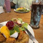 Raga Coffee and Homemade Bakery is the cutest spot, with enough insta worthy photo opportunities to satisfy the social influencers. Situated on Wiset Road (Rawai) they have parking in front of their premises. The busy road disappears as you walk into their rainforest terrace complete with a waterfall and stepping stones across a koi carp pond. The premises are gorgeous, there’s no doubting the setting. It was a bit off putting to be sent to the counter to order our food, we would have much preferred to browse the menu from a seating area. We felt under pressure to make a decision whilst the numerous staff looked on. Decision made, we paid and were issued a table number being free to choose where we wanted to sit. There are tables located throughout the garden terrace, or indoors if preferred. I ordered the crispy chicken with eggs benedict on sourdough bread with a mint cocoa cold drink. Mike went for scrambled egg on sourdough with a mixed berry smoothie (734 baht). Both dishes looked beautiful on presentation. I love the American style of crispy chicken for breakfast, however there wasn’t any spice or flavour in this coating, the over riding flavour I could taste was vinegar. I couldn’t work out if the eggs had been cooked in it or it was from the benedict sauce. Mike’s eggs were creamy and delicious.