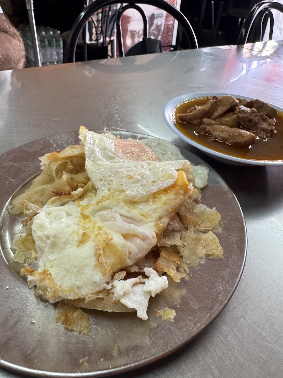 Our first breakfast in Phuket was at Roti Taew Nam on Thep Krasattri Road (Tambon Talat Yai) in old town Phuket. This cafe is a 70 year old breakfast institution unchanged by time. Open only in the mornings, expect a no-frills setting with limited seating and authentic roti cooked over charcoal. Language is not a problem, on arrival we were issued with a photo menu, menu pad and pencil to write the menu options and quantity down. We tried the 2:2 which is 2 roti and 2 fried eggs (40 baht), the combo really works and I enjoyed mopping up the yolk with pieces of shredded roti. We also wanted to try the Massaman curry with roti (70 baht), we had the chicken version which was tasty if not a little thin consistency on the sauce. Finally we had to try the banana egg roti (40 baht) which was fabulous. For us we didn’t need the sugar or condensed milk dipping options served on the side it was sweet enough. Washed down with a Thai style black coffee and lemon tea (50 baht).