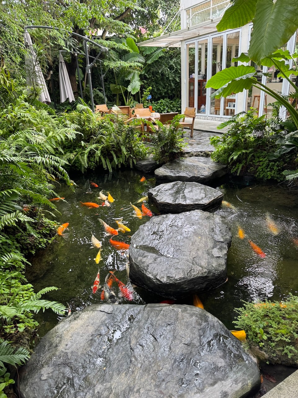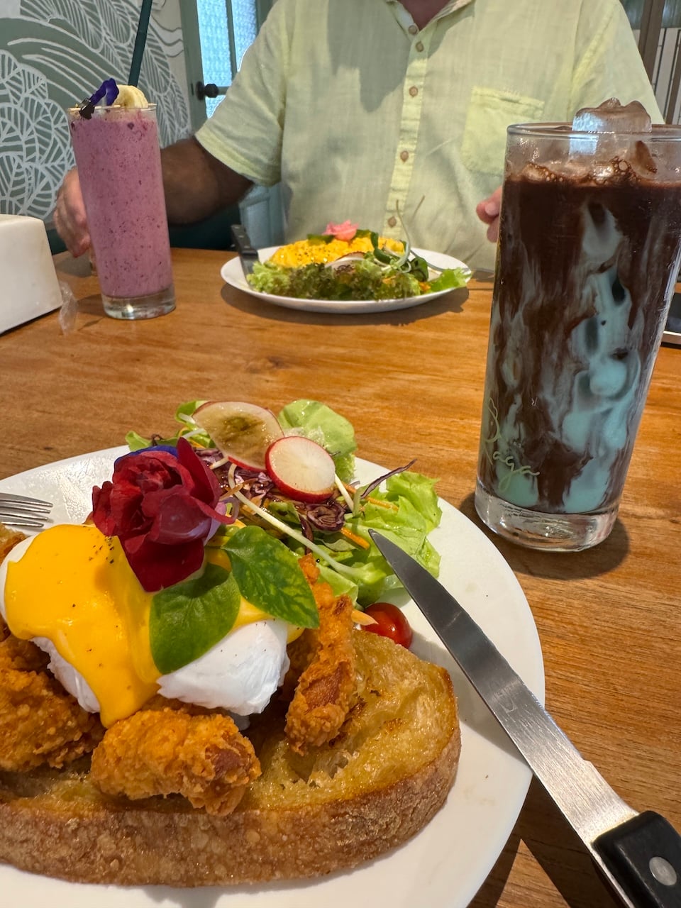 Raga Coffee and Homemade Bakery is the cutest spot, with enough insta worthy photo opportunities to satisfy the social influencers. Situated on Wiset Road (Rawai) they have parking in front of their premises. The busy road disappears as you walk into their rainforest terrace complete with a waterfall and stepping stones across a koi carp pond. The premises are gorgeous, there’s no doubting the setting. It was a bit off putting to be sent to the counter to order our food, we would have much preferred to browse the menu from a seating area. We felt under pressure to make a decision whilst the numerous staff looked on. Decision made, we paid and were issued a table number being free to choose where we wanted to sit. There are tables located throughout the garden terrace, or indoors if preferred. I ordered the crispy chicken with eggs benedict on sourdough bread with a mint cocoa cold drink. Mike went for scrambled egg on sourdough with a mixed berry smoothie (734 baht). Both dishes looked beautiful on presentation. I love the American style of crispy chicken for breakfast, however there wasn’t any spice or flavour in this coating, the over riding flavour I could taste was vinegar. I couldn’t work out if the eggs had been cooked in it or it was from the benedict sauce. Mike’s eggs were creamy and delicious.