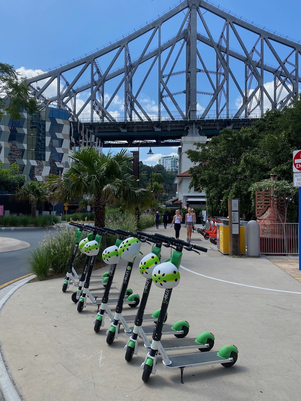 We first walked away from the city on the New Farm Riverwalk, this is a walkway over water along the riverbank which is divided into a footpath and cycleway. Then we hired e scooters to return and continue in the other direction. Taking us along the city waterfront past the Botanic Gardens and across Victoria Bridge to finish at the South Bank gardens. It was a gorgeous blue sky day, we enjoyed chilling out at the Stoke Bar Q in the shade watching the river life.