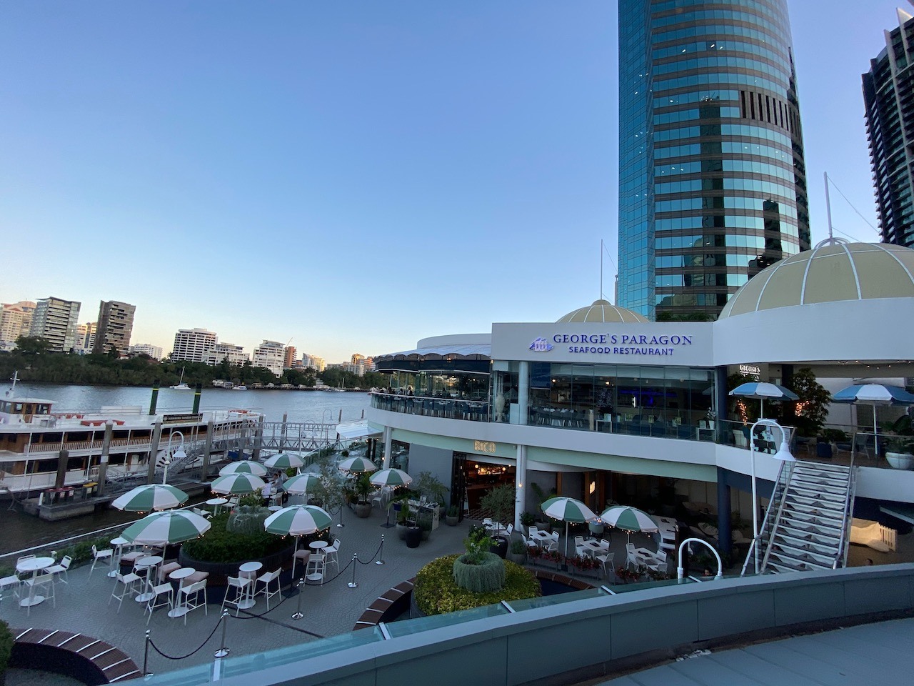 Our only evening meal out in Brisbane was at George’s Paragon seafood restaurant. We wanted to dine on Moreton Bay bugs and their terrace offered a lovely sunset view. If you like shellfish, you have to try Morton Bay Bugs – they’re amazing!