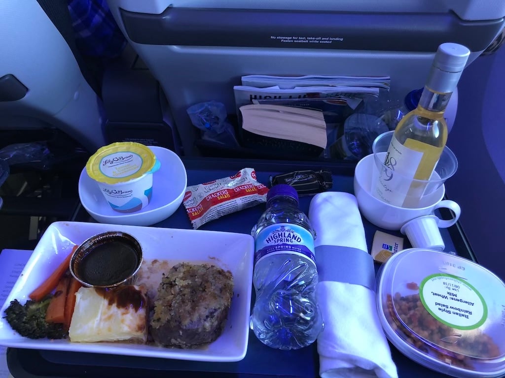 As soon as the seat belt signs were turned off, the drinks trolley came out, so we could enjoy a pre dinner drink, and we were given a printed menu with the meal choices of the day. We both opted for the beef, and it was extraordinarily good! A perfectly cooked steak, served with a spicy sauce, vegetables and sauté potatoes. There was also a small starter of feta and olives, a very nice chocolate pudding, and some cheese and biscuits. We also had a choice of four wines, and decent coffee to follow. It was all served with proper crockery, metal cutlery and real glasses. Wherever you sit in World Traveller Plus, the service is quick as the cabin is so small.