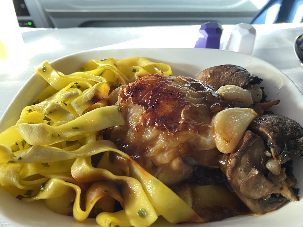Our aircraft was a fairly old 767 which had very recently been refurbished, so the cabin looked and smelled very new and fresh. The seats in premium economy are in a 2-2-2 layout, and we had chosen two together, on the port side. The seats are really, really comfortable. They are wide and there’s loads of legroom. They are proper recliners, with footrests that pop up as you go back. Another touch we liked is that the tray tables come out of your own armrest, so your table doesn’t move when the person in front does. A flight attendant came around as soon as we’d settled ourselves into the seats, with Champagne and this was followed soon after by a hot towel, while the rest of the aircraft boarded.