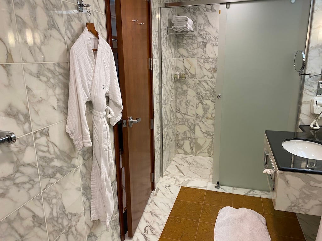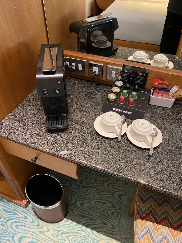 The room was also exceptionally well equipped for this kind of short stay between flights – there was a Nespresso machine, a kettle, an iron and board, a hairdryer and a huge range of toiletries, as well as toothbrushes and toothpaste and even razors and shaving foam.
