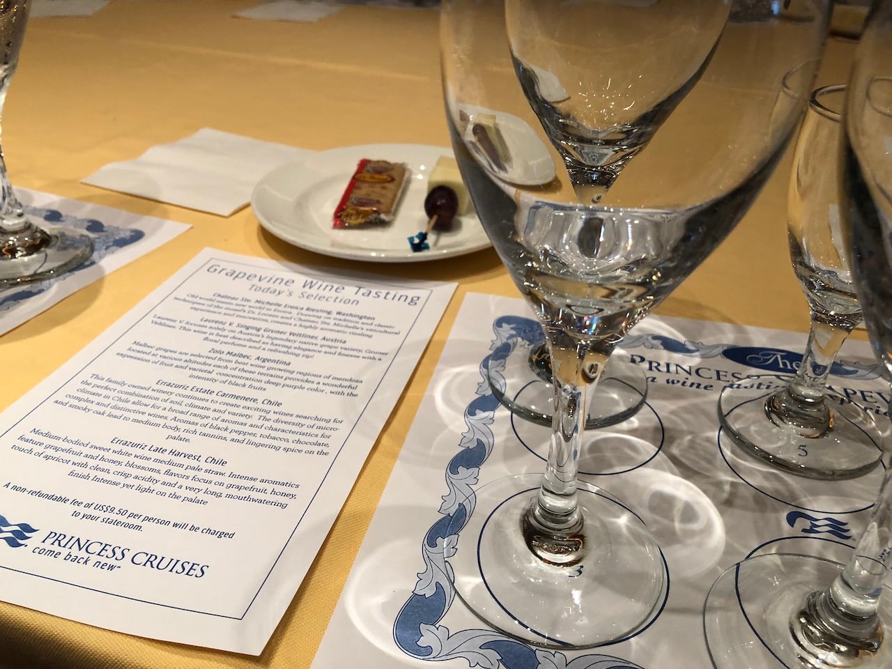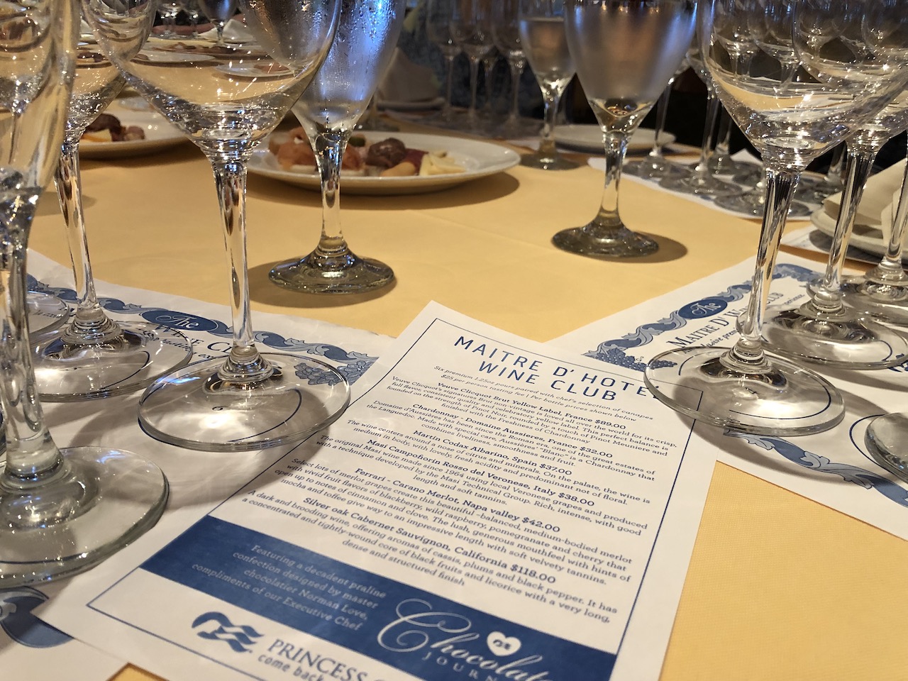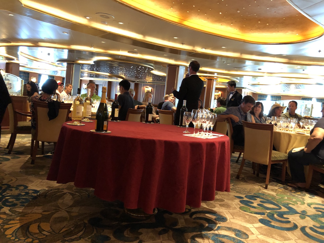 We’d booked the Maitre d’Hotel Wine Club for the afternoon of our first day at sea. The charge of $25pp included 6 premium wines as selected by Rui Pereira from the ship’s million dollar cellars. The event was well attended, and a sell out. The Emerald Princess sommeliers were brilliant, we had 3 of them, each presenting 2 wines. They were very entertaining as well as informative, often making us laugh with their wit and charm. Unfortunately our wine waiter was bit stingy on the measures, leaving us just a mouthful for tasting, where as some of the other tables were struggling to consume each glass, before the next wine was presented. A second tasting has been scheduled for the second day at sea, so we booked. This time the charge is $9.50pp for a grapevine tasting under the heading “A day without wine is like a day without sunshine”. This event also allowed us into the Botticelli Dining Room, usually assigned for passengers on fixed dining tables.