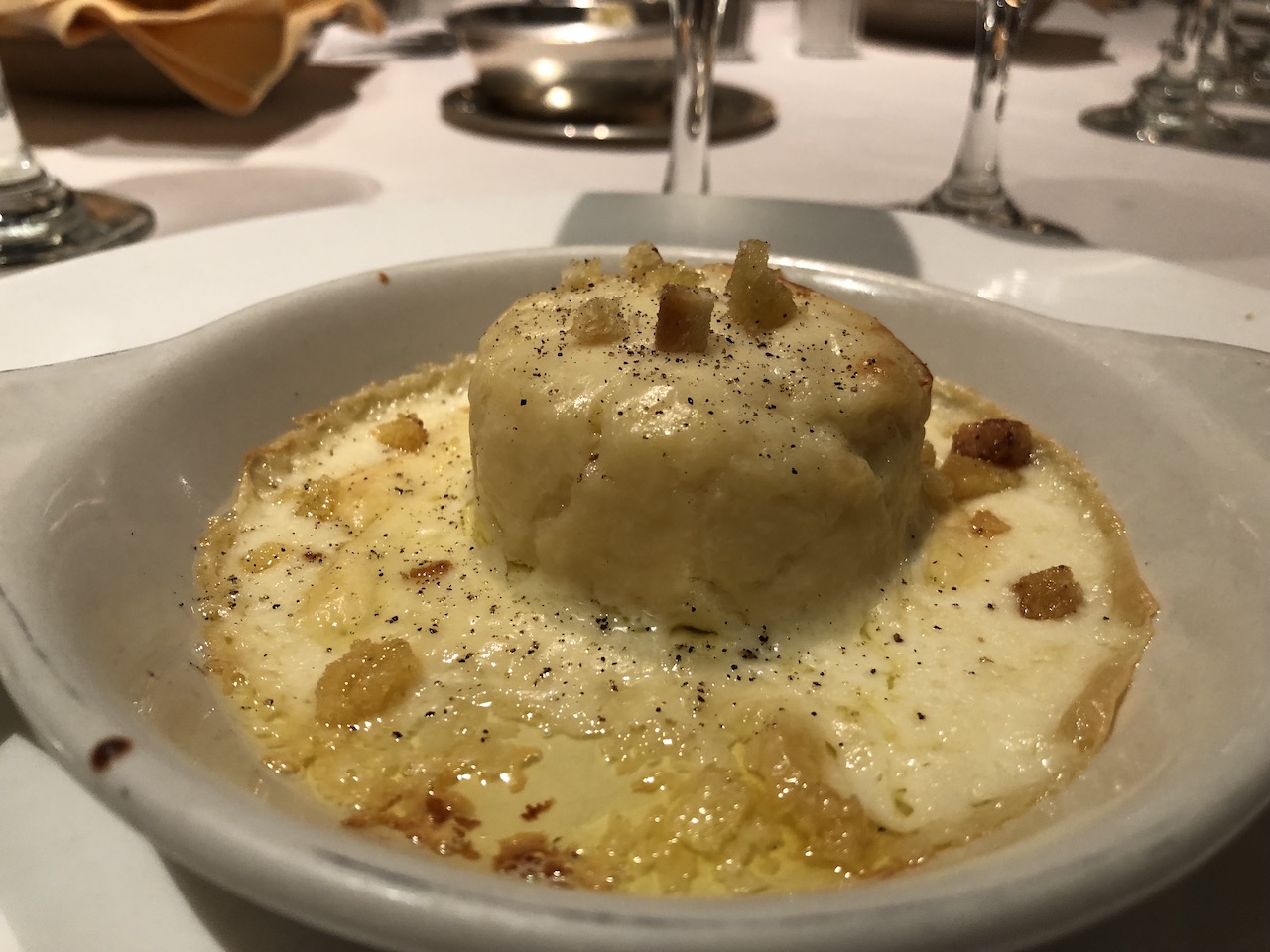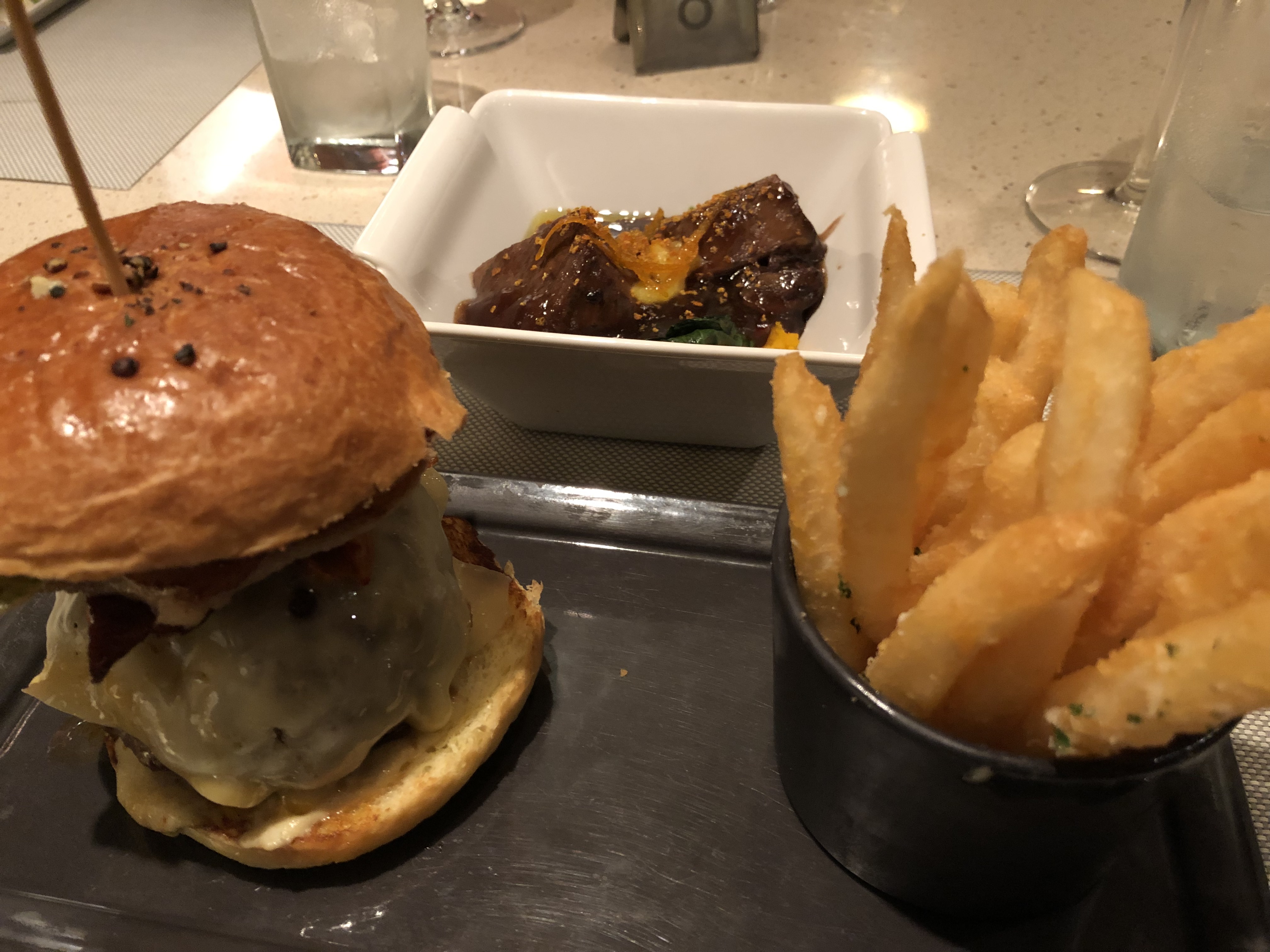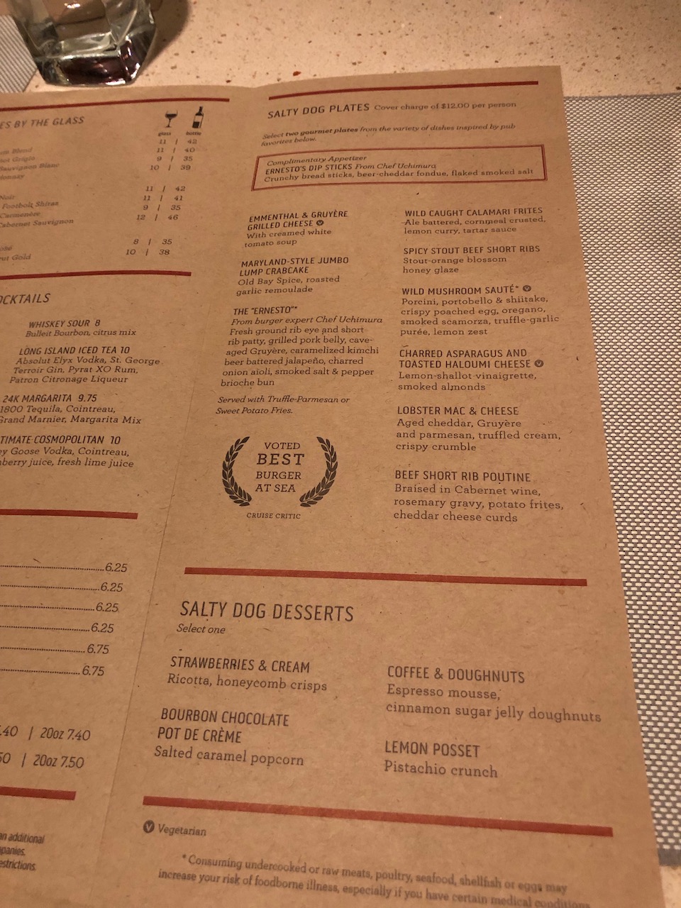 This evening we decided to watch the early performance of the Princess singers and dancers in their production show DISCO…Blame it on the Boogie before dining. We made a reservation at the Salty Dog gastropub to try their menu for a change. There’s a cover charge of $12pp for this restaurant. You can choose a combination of 2 dishes, plus a dessert. We selected the Maryland Style Jumbo Crabcake, The Ernesto (award winning burger), Spicy Stout Beef Short Ribs and Wild Caught Calamari Frites for our mains and shared them tapas style.