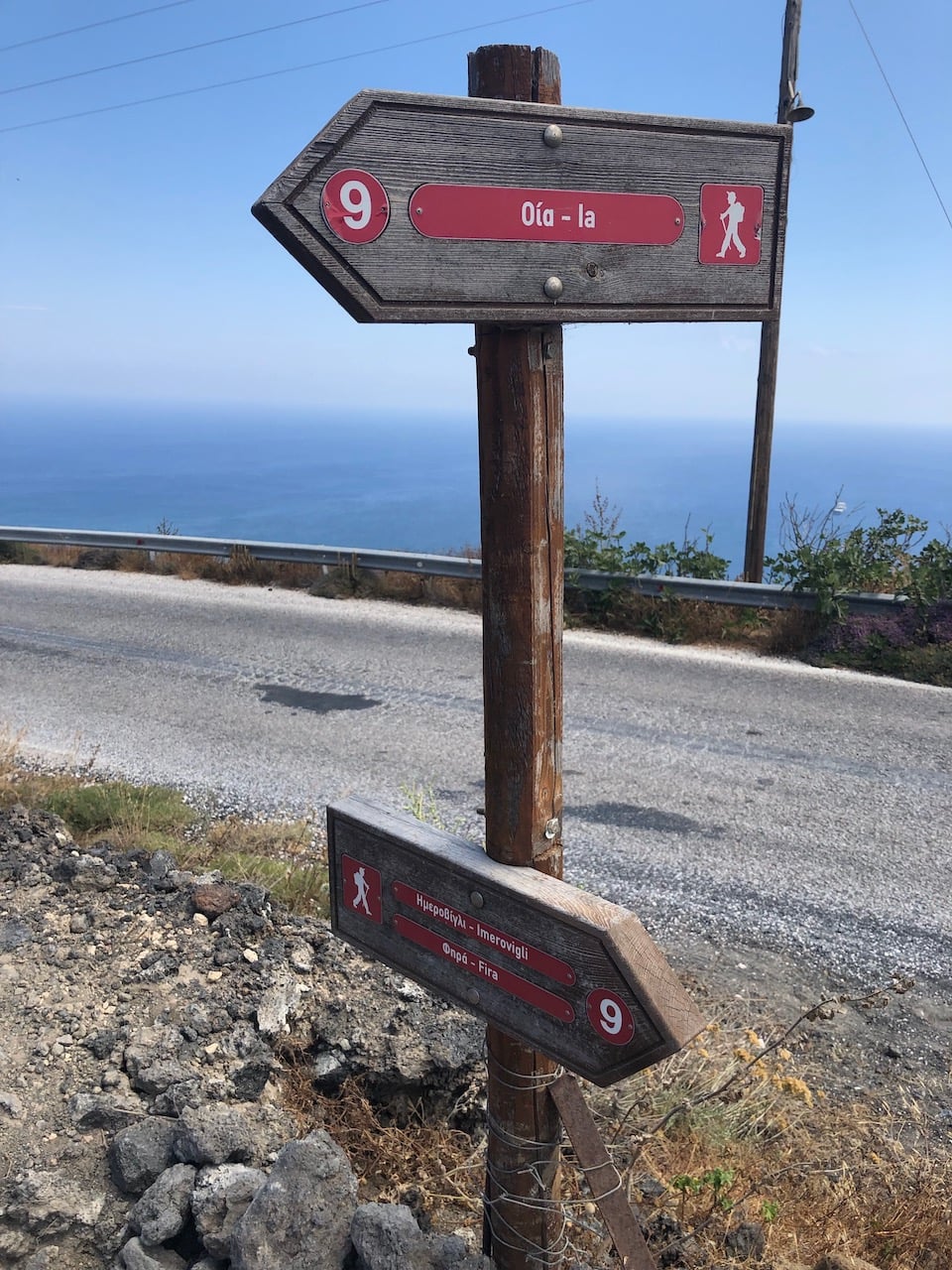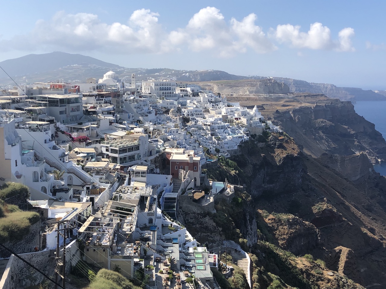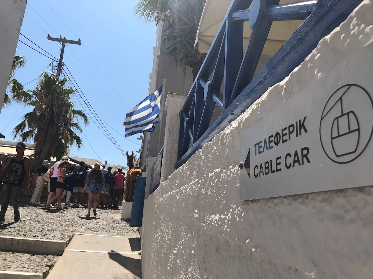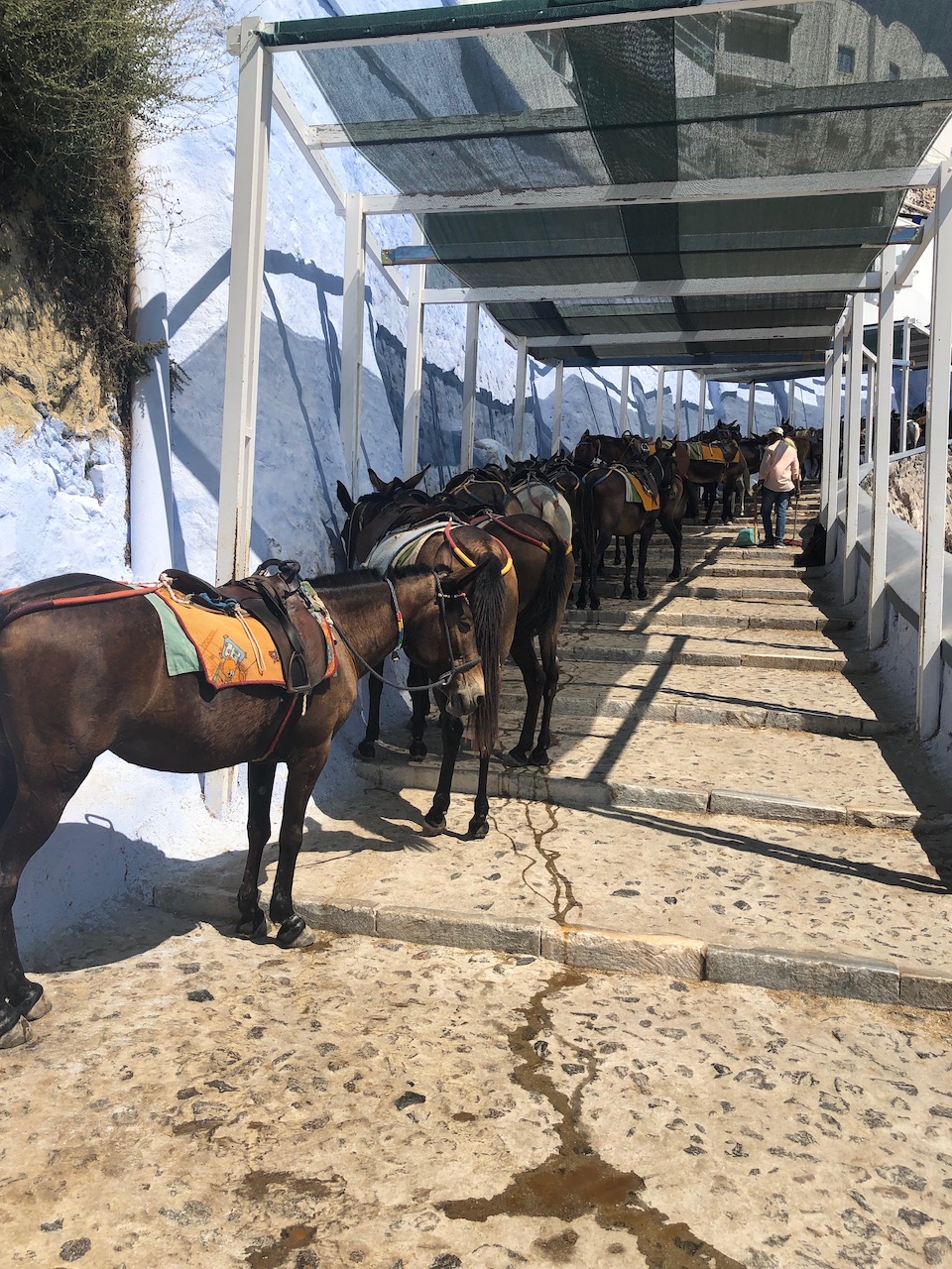 We went to the famous viewpoint with the two blue domed churches, before walking to the edge of Oia to pick up the caldera footpath. It wasn’t obvious where to go, we simply kept to the top of the cliff and soon we were on a track heading in the right direction. For more information about this walk, you can read our more detailed article Caldera Hike Santorini. We arrived back in Fira at 15:00, the cable car queue was already stretching down the street and around the corner. We decided to walk the donkey steps (587 of them) down to the harbour, it sure does stink!