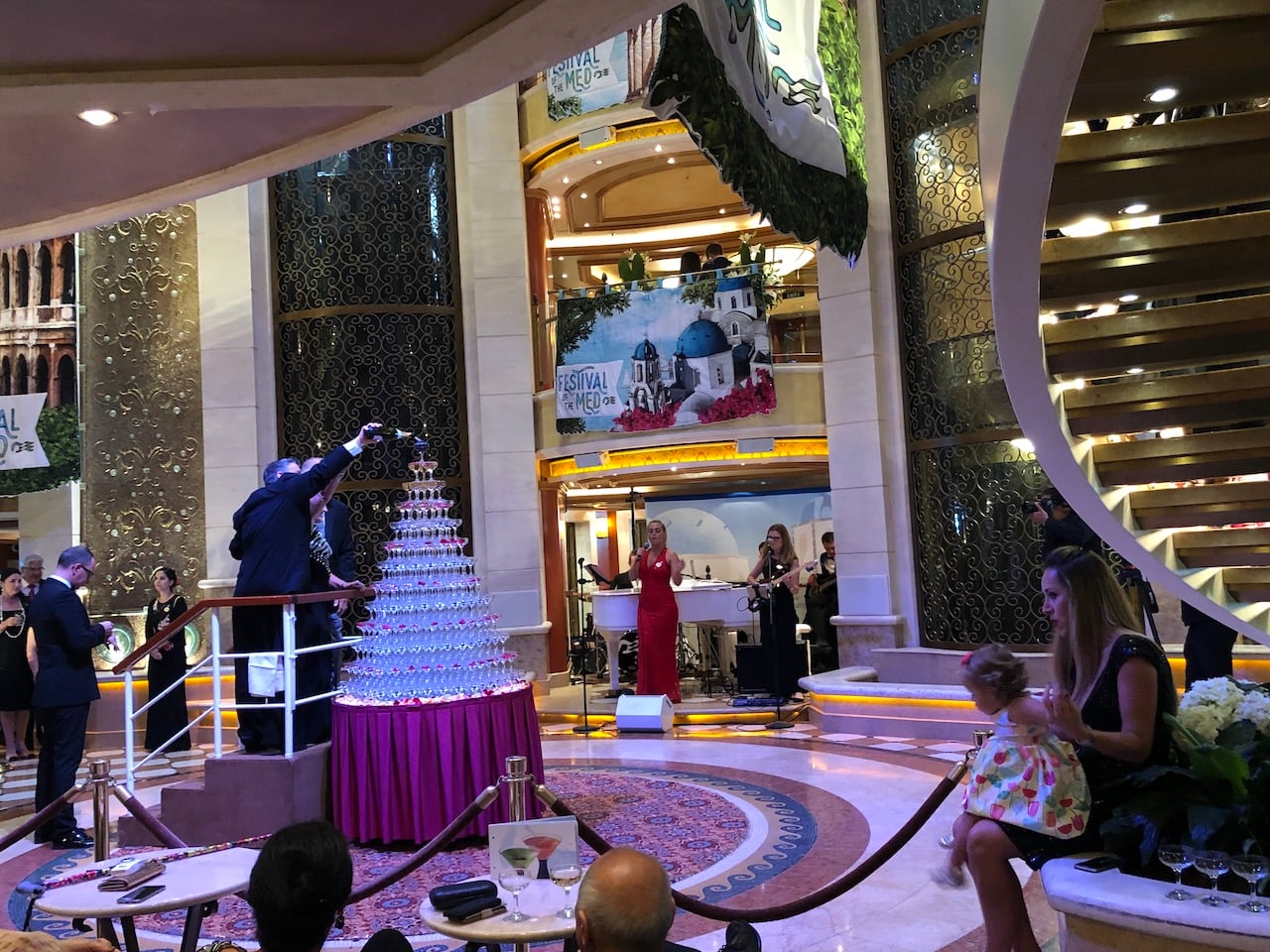 It was a formal evening, so we dressed to impress and made our way to the Piazza for the Captains Welcome Aboard Champagne Waterfall Party. There was an everlasting queue of willing volunteers to step up and pour fizz over the tower, whilst posing for the ships photographers. Our Captain, Steven Lewis gave a welcome speech and introduced the heads of departments.