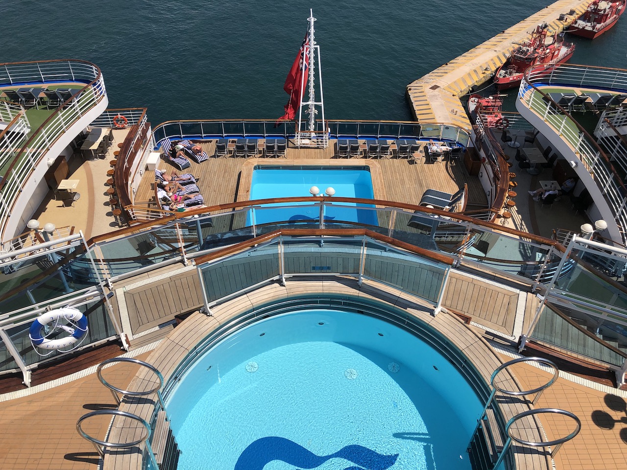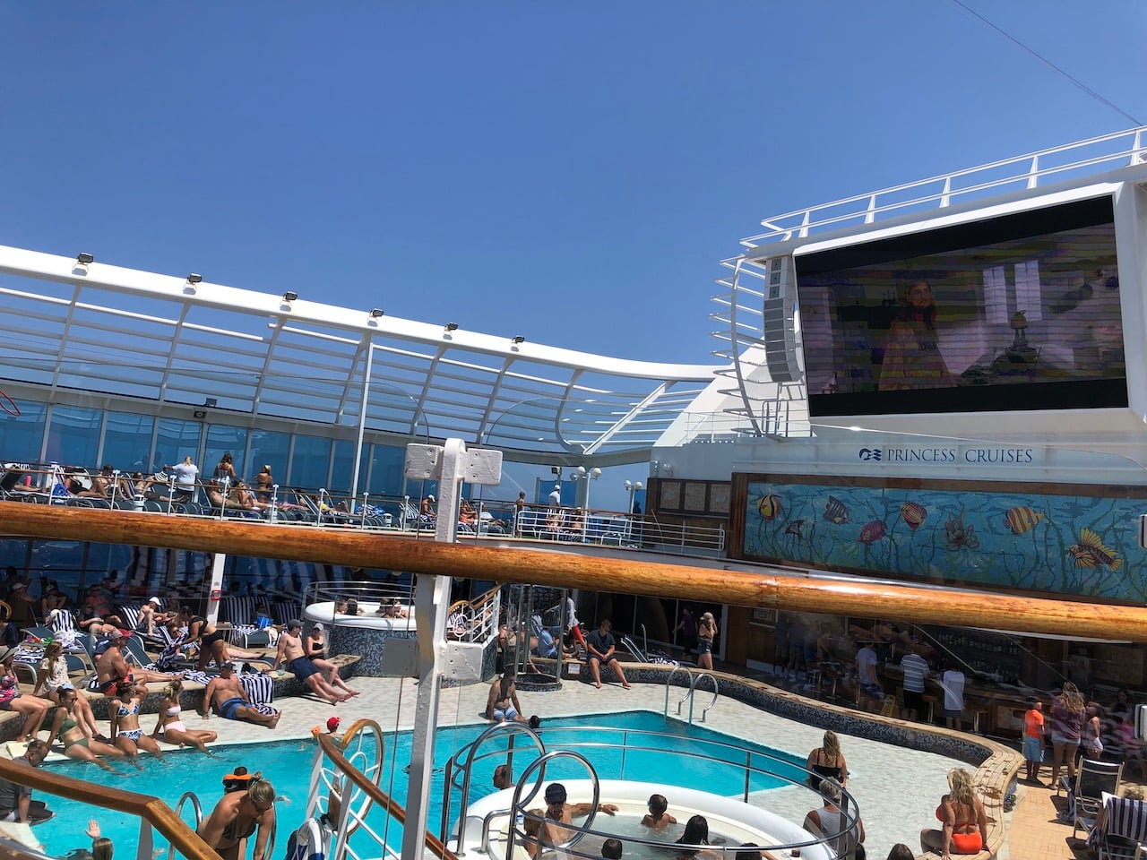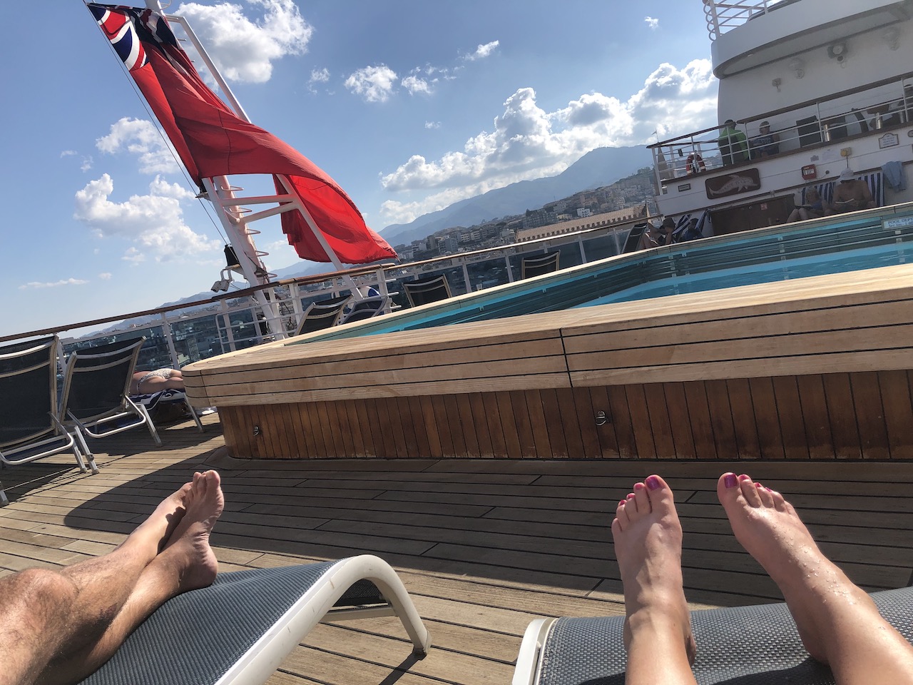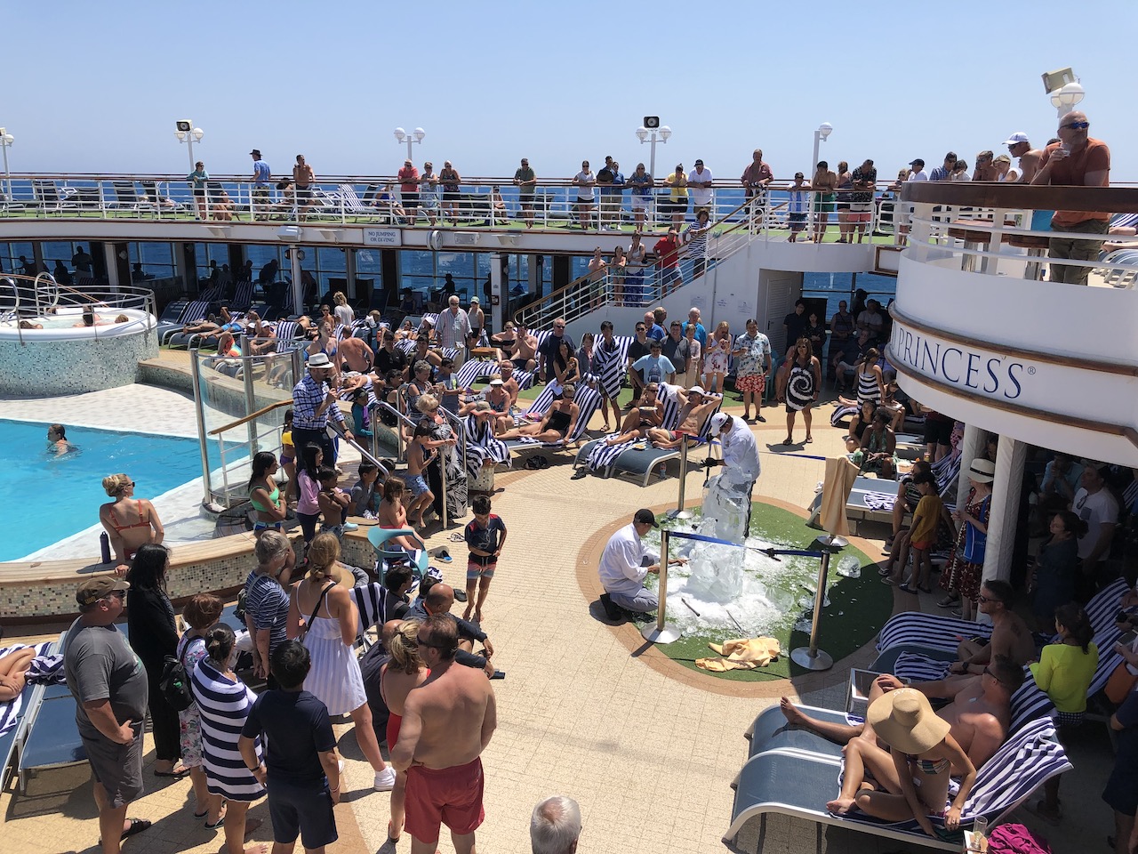 Our last full day aboard was a sea day, having realised that our internet wasn’t working, we had to resign ourselves into enjoying a full day off work! We shortlisted the events we wanted to include from the latest edition of the Princess Patter. It was actually quite difficult as there were a few that appealed but clashed with each other. The Culinary Show with the Executive Chef Russell Clarke and Maitre d’ Rui Pereira was brilliant! It had packed the main Princess theatre, their commentary whilst preparing dishes was very funny. Next we hit the gym, it was busy but there were plenty of cardio machines available for an hour’s work out with a panoramic view. I’d been wanting to watch one of the Movies Under The Stars all week, so next on the agenda was a daytime showing of Mama Mi! Here We Go Again. We were lucky to find 2 sun beds available as the decks in this area were packed. We watched the ice sculpting demonstration, these guys were from families of ice sculptures, the trade handed down through the generations. Next it was time for our second wine tasting event. We enjoyed the experience and were pleasantly surprised by some of the wines listed, but it wasn’t as well attended or presented as the first one.