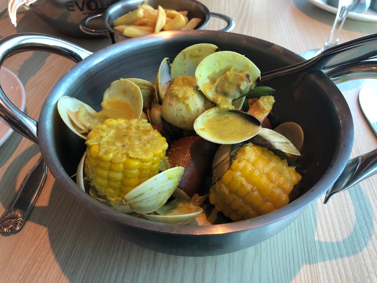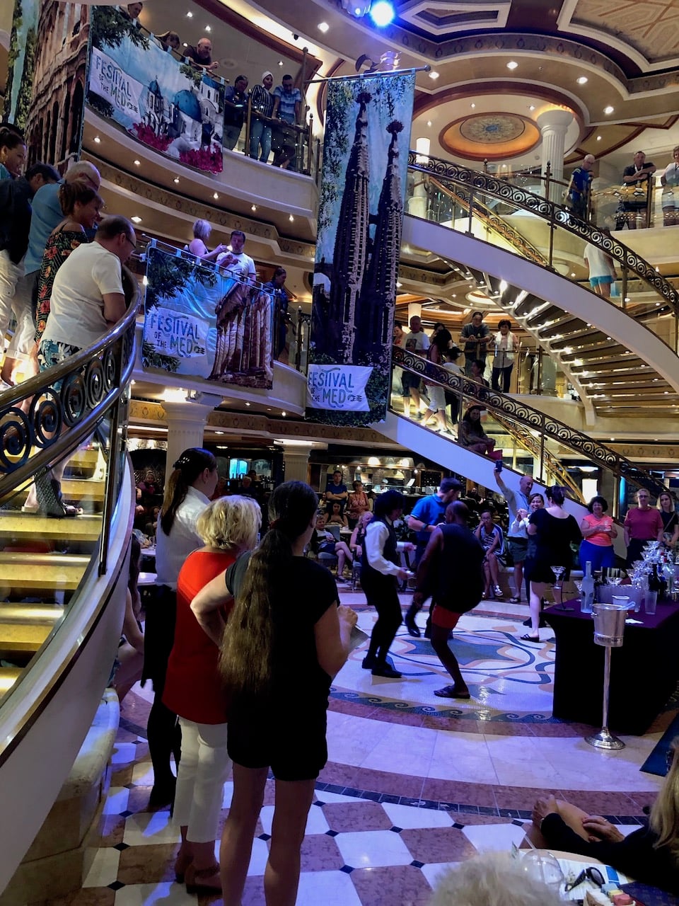 Our last evening was at another speciality restaurant with a $12pp charge, this time it was Steamers for seafood. There are 3 courses, the starter is a choice of caesar salad or clam and smoked ham chowder. The main course is a choice of 2 steamers – black & blue mussels or classic clam, and a choice of 3 sauces marinero, cioppino or bacon curry,. Or a third main course option of fried seafood platter. A lobster tail and king crab legs could be added for $10. Desert was key lime pie or strawberry shortcake. Afterwards we toured a selection of the evening entertainment shows. The ship was very quiet in comparison with other evenings, we assumed people were busy packing their cases for the 10pm deadline. We enjoyed the Greg London show in the main theatre, this guy was incredible at imitating famous singers, switching from one to the other with a change of wig / jacket. Accompanied by talented musicians from the ship’s orchestra. Doug Funk at Comedy Showtime was also funny, dragging members of the audience up to help him on stage. We finished the evening with the 2000’s Dance Party in Club Fusion. This was the final performance from The Sound, who were finishing their tour in Barcelona the next day.
