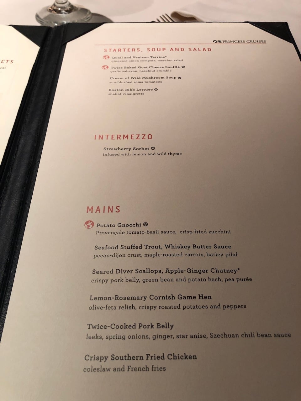 We decided to return to the Michelangelo restaurant and asked for a table to share. This time we sat at table 256, we noted the number as our waitress Ylena was fabulous. Sharing our table was a couple from Canada who regularly cruise with Princess, and a family from Nottingham, UK who have returned to cruising with their 16 year old daughter after a 10 year break. Both of these parties were delighted to have secured a space on Ylena’s tables and we were soon to find out why. Ylena recommended the white rum tapioca fruit salad, and braised lamb shank with lemon, garlic and thyme for mains. The majority of us complied, Mike ordered her second choice of Catalan- Style Flatbread Tapas and Medallions of Beef Tenderloin, with Cognac and Peppercorn Demi-Glace. Ylena is an absolute delight, she is confident, amusing and assertive. If you dared to deny yourself a dessert, you were served a plate with “nothing” scribed on it in decorative sauce!