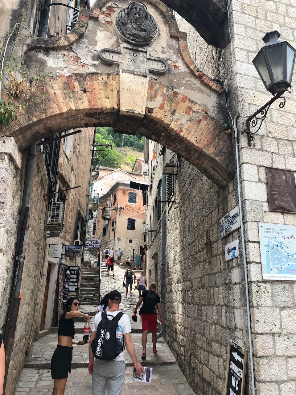 We decided not to walk up to the fortress, which is 1350 steps, 1.2km and 260m above sea level. If you fancy it, the blue / yellow route is supposed to be the best option. Instead we took a leisurely walk around the old town. First out to the Gurdic Gate (South Gate), I wanted to capture a reflection of the wall, but the rubbish floating around in the water below spoiled it. We worked our way around the maze of streets, also stopping to admire the River Gate (North Gate), which had crystal clear water flowing down from the mountains above. Kotor is very picturesque, it’s easy to understand why the old town has earned its UNESCO status. I had been informed that there are loads of cats, and many of the tourist mementos have a cat theme. However we only saw a handful of felines scattered around the place on our walk through.