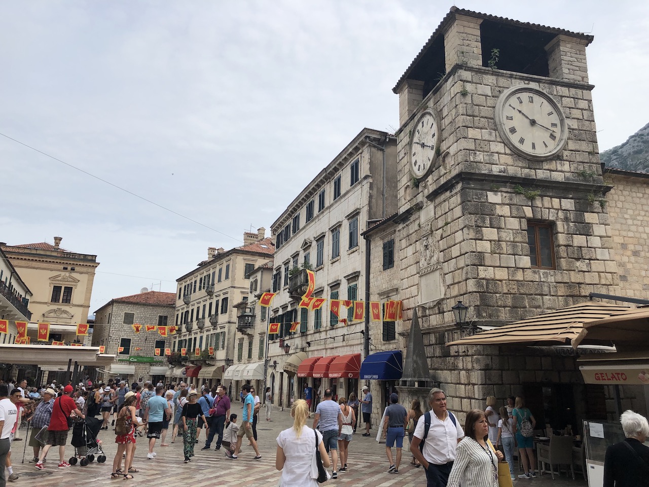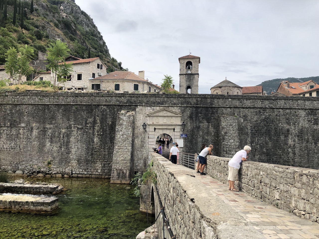 We were warned of a 1 hour time change ahead of our overnight arrival into Montenegro. What we didn’t realise is that the ship’s internet and our own worldwide wifi device would not be connected in this destination. So, if you need to get online without costing a fortune (not within EU roaming), get off and head for a a cafe / bar with free wifi in town. There were 4 cruise ships due in to Kotor that morning, luckily for us the Emerald Princess had secured the prime tender location. The other two ships (Celebrity Infinity) & Norwegian Star) had a 35 minute tender journey to reach the port, and SeaDream Yacht Club was small enough to dock alongside. As you exit the port, don’t try and cross the road in front of you, walk to the right, past the boat excursion companies. Shortly you will find the pedestrian crossing, directly in front of the sea gate (west gate) to access the old town.