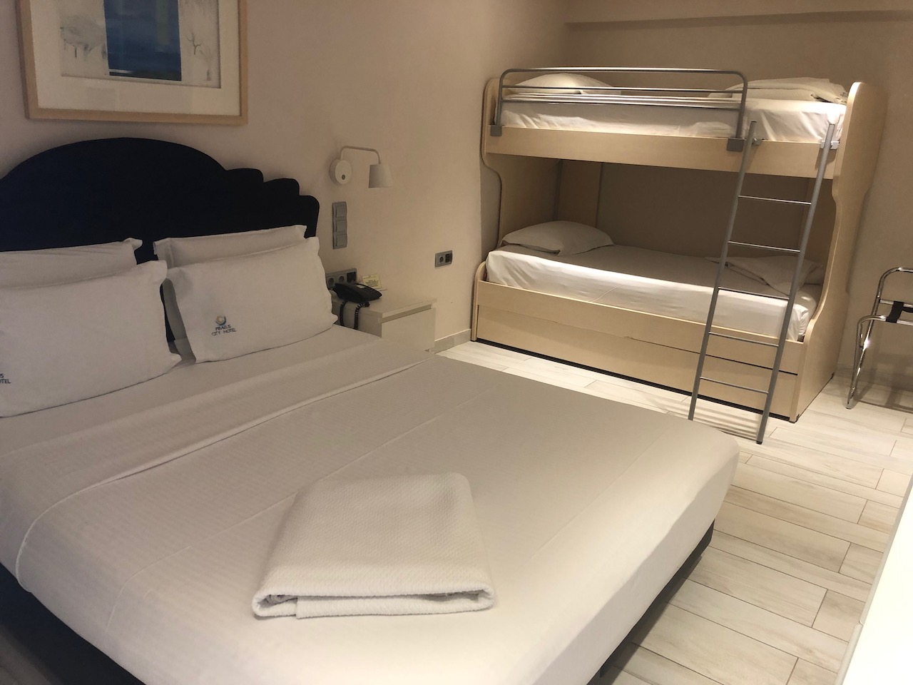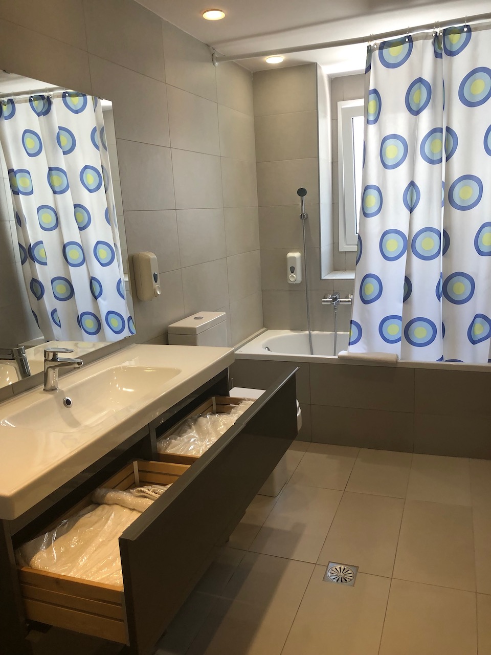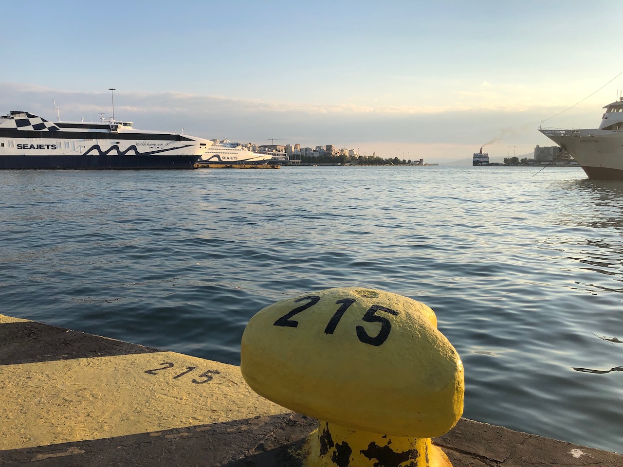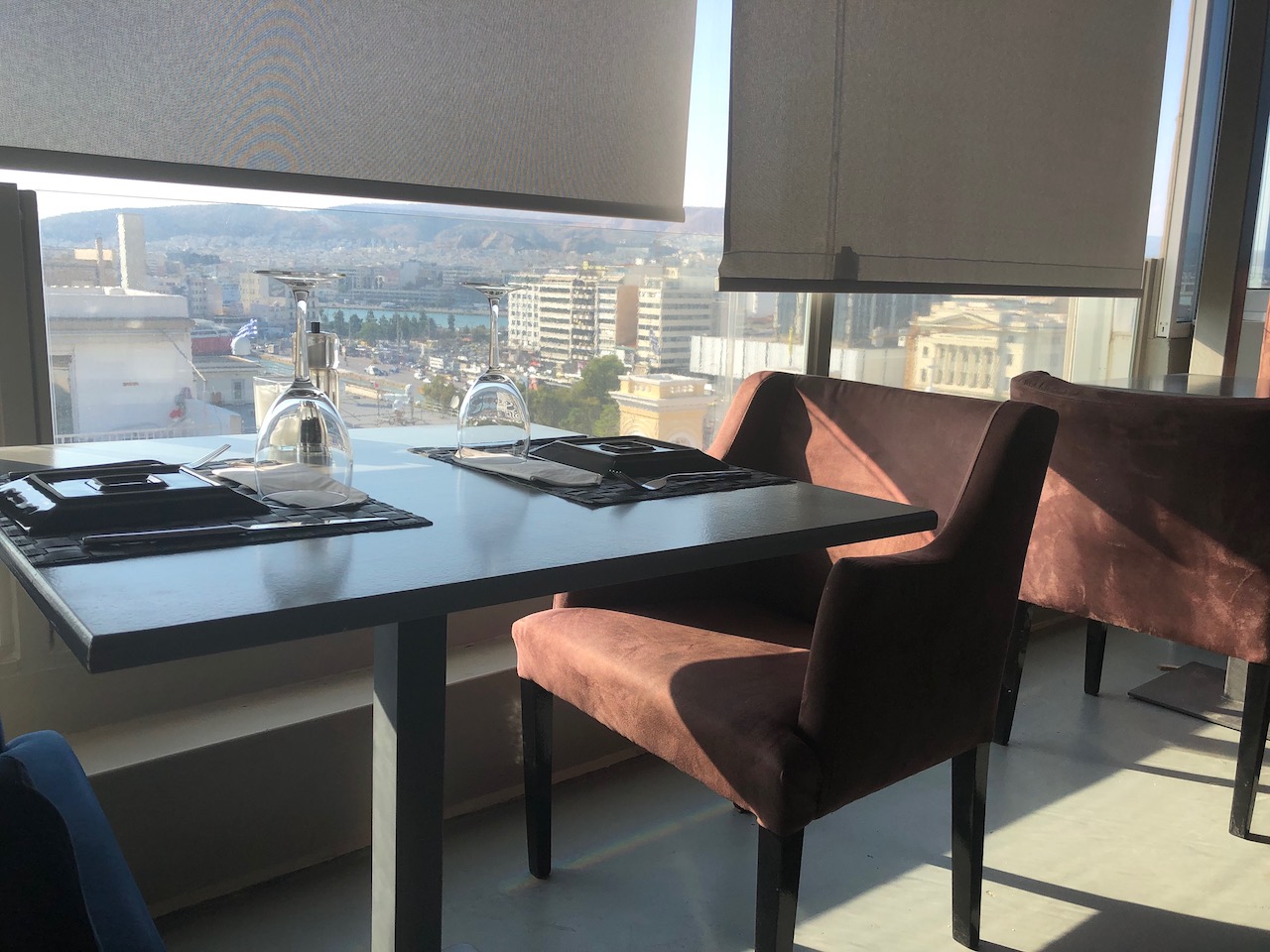 We had booked an executive double room at the Piraeus Dream. However on check in, we were offered a suite room (408) which suited us perfectly, as we could catch up with our work in the living area. Plus we had an enormous balcony. This hotel room met our basic requirements when travelling which includes efficient air conditioning, a good wifi service, plenty of sockets (there were 18!), good level of cleanliness and a comfortable bed with nice linen. If I was being picky the shower was awkward, it was fixed to the wall at a low level aimed at guests taking a bath, so to have a stand up shower, required holding it free hand. We enjoyed an evening drink at the hotel’s roof bar restaurant Niners, which has a great view where you can watch the ships arriving at the ferry port.