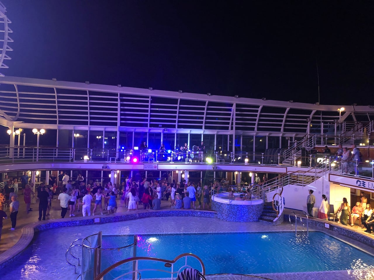 We made the decision to go back aboard, and chill out by the adults only pool on the aft deck, which we almost had to ourselves. Later we dined in the Da Vinci restaurant and was placed with 3 other couples, two travelling together from Sydney and a couple originally from London, living in Brisbane. After a dinner of cheese soufflé and a main course of scallops it was time for the Deck Party. There was live entertainment from The Sound, who had everyone up and dancing.