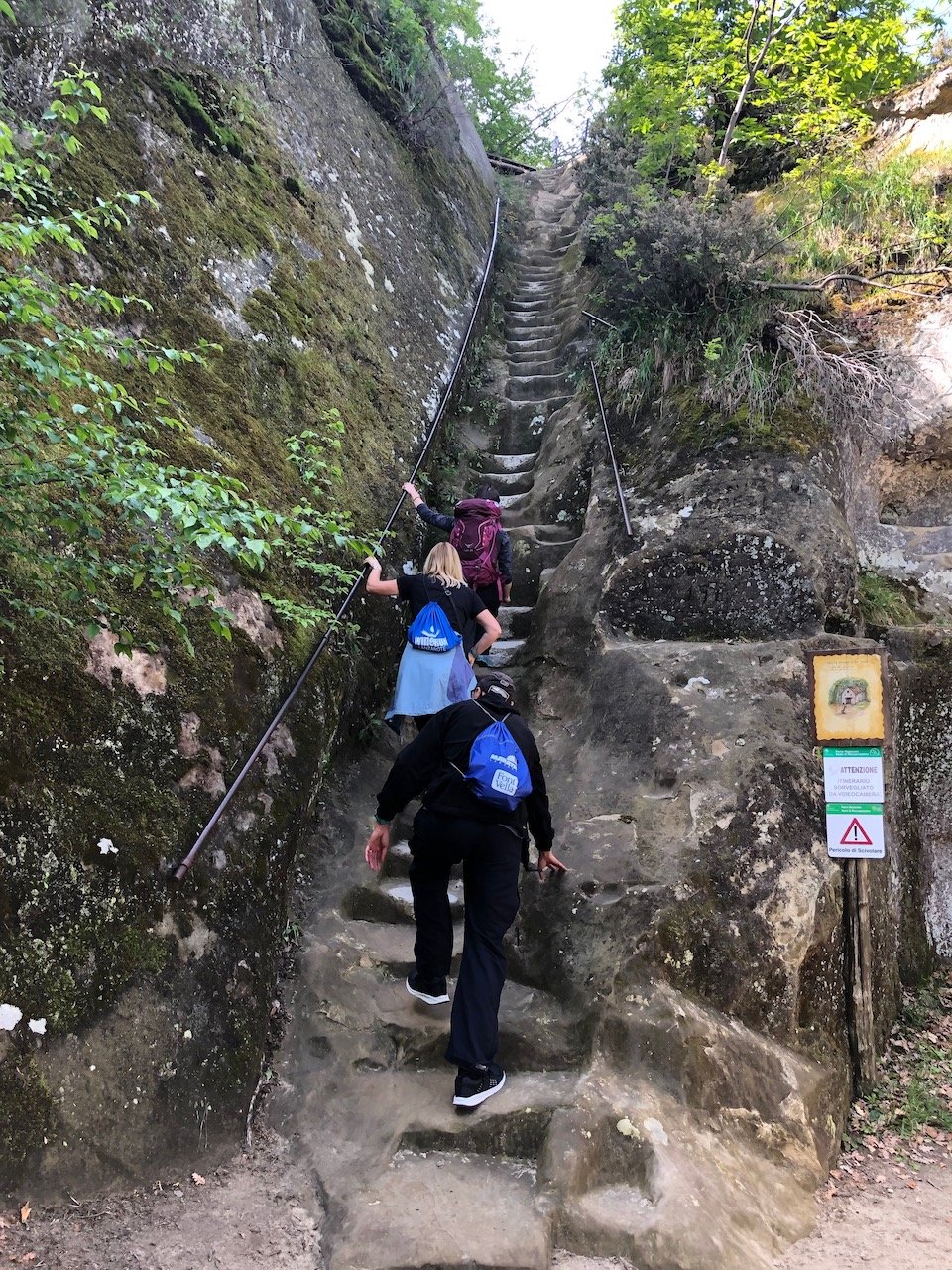 We headed to the mountains and climbed up over 750m during the drive to visit the Beltaine Brewery where we met Mateo the brewer, and Piero the promotor. After a tour and description of how to make beer from chestnuts, we visited the Parco Didattico Sperimentale del Castagno to see the different varieties between the food producing chestnut trees, and trees cultivated for furniture / wood. It was raining, but that didn’t deter us from a guided walk around the chestnut park with Luca, and a cosy lunch and tasting in the event centre. We also visited the Racchetta Mattei designed by the Count Cesare Mattei, the construction of this unique building begain in 1850. Evening meal was at the farmhouse.