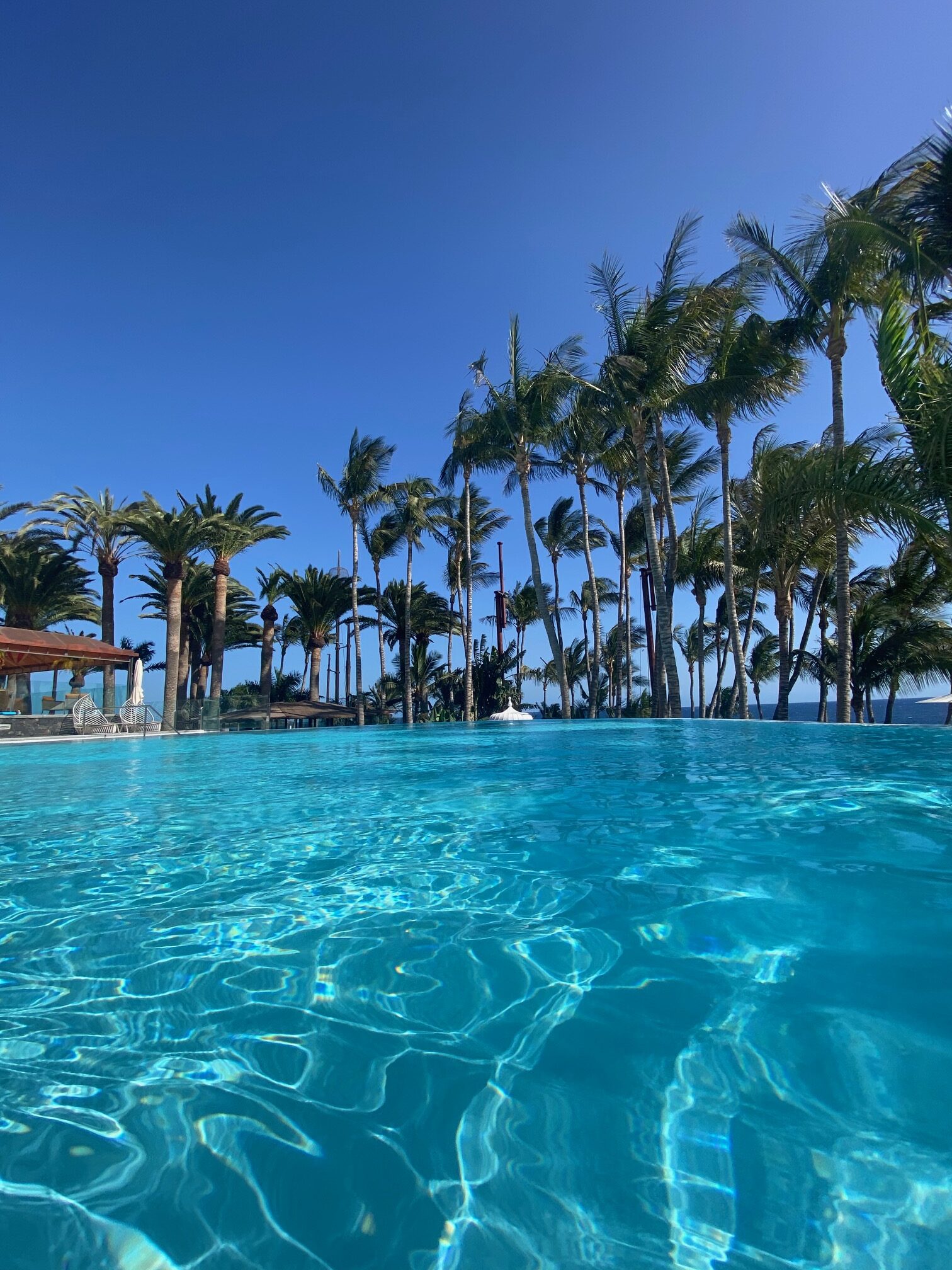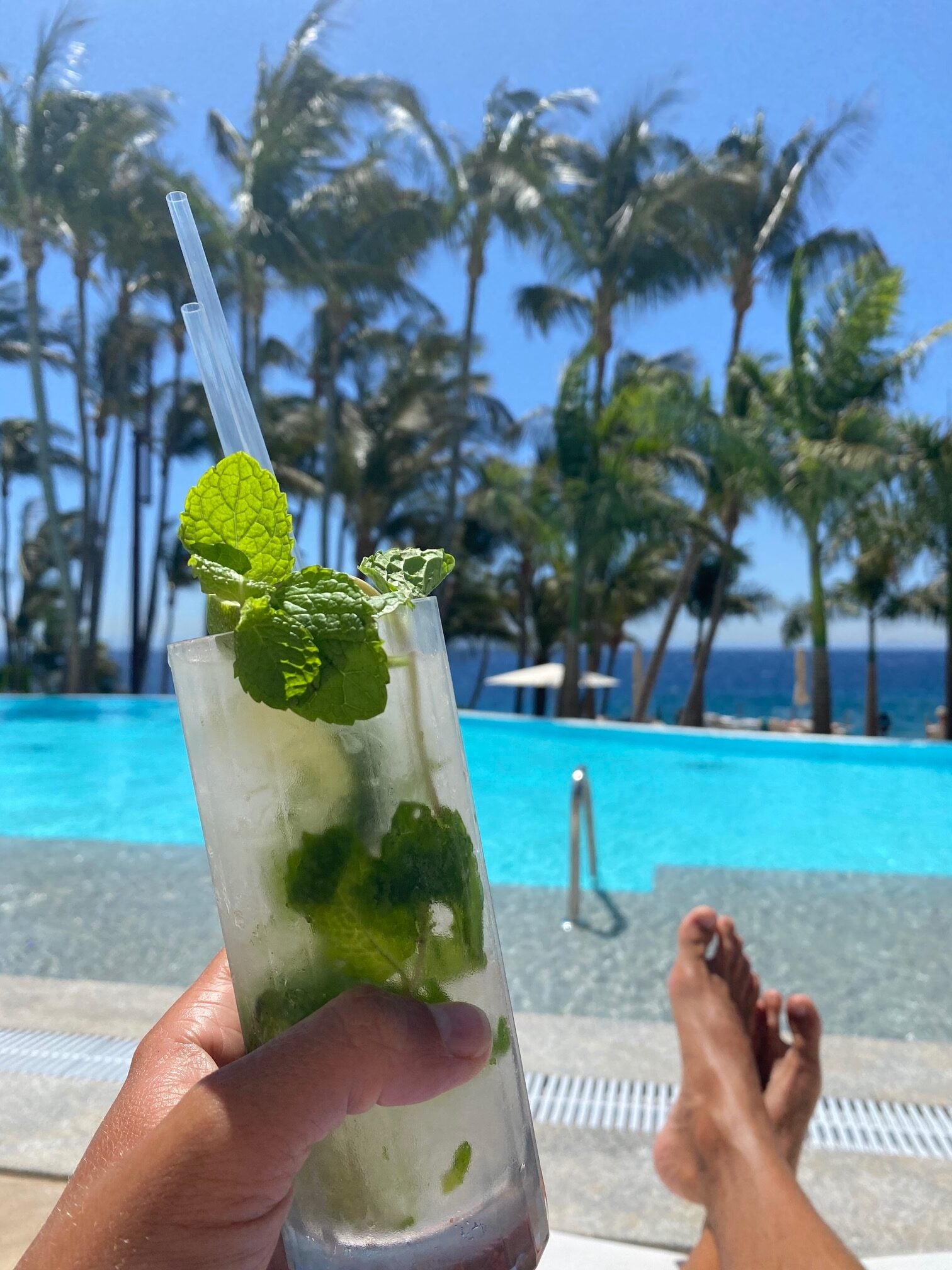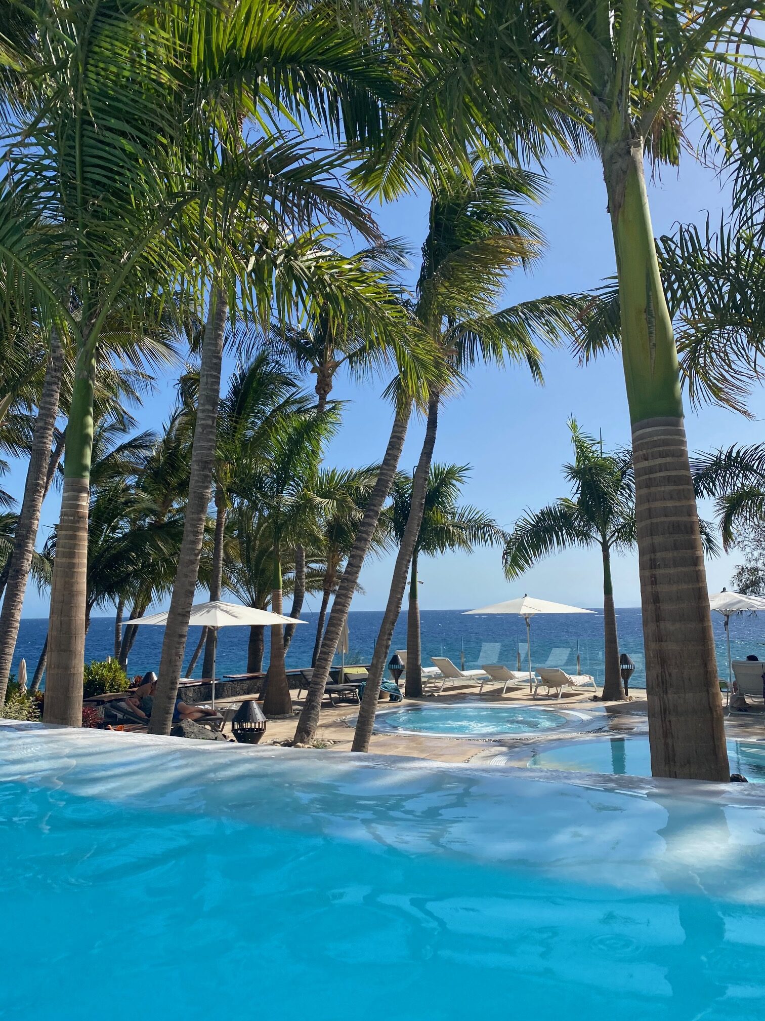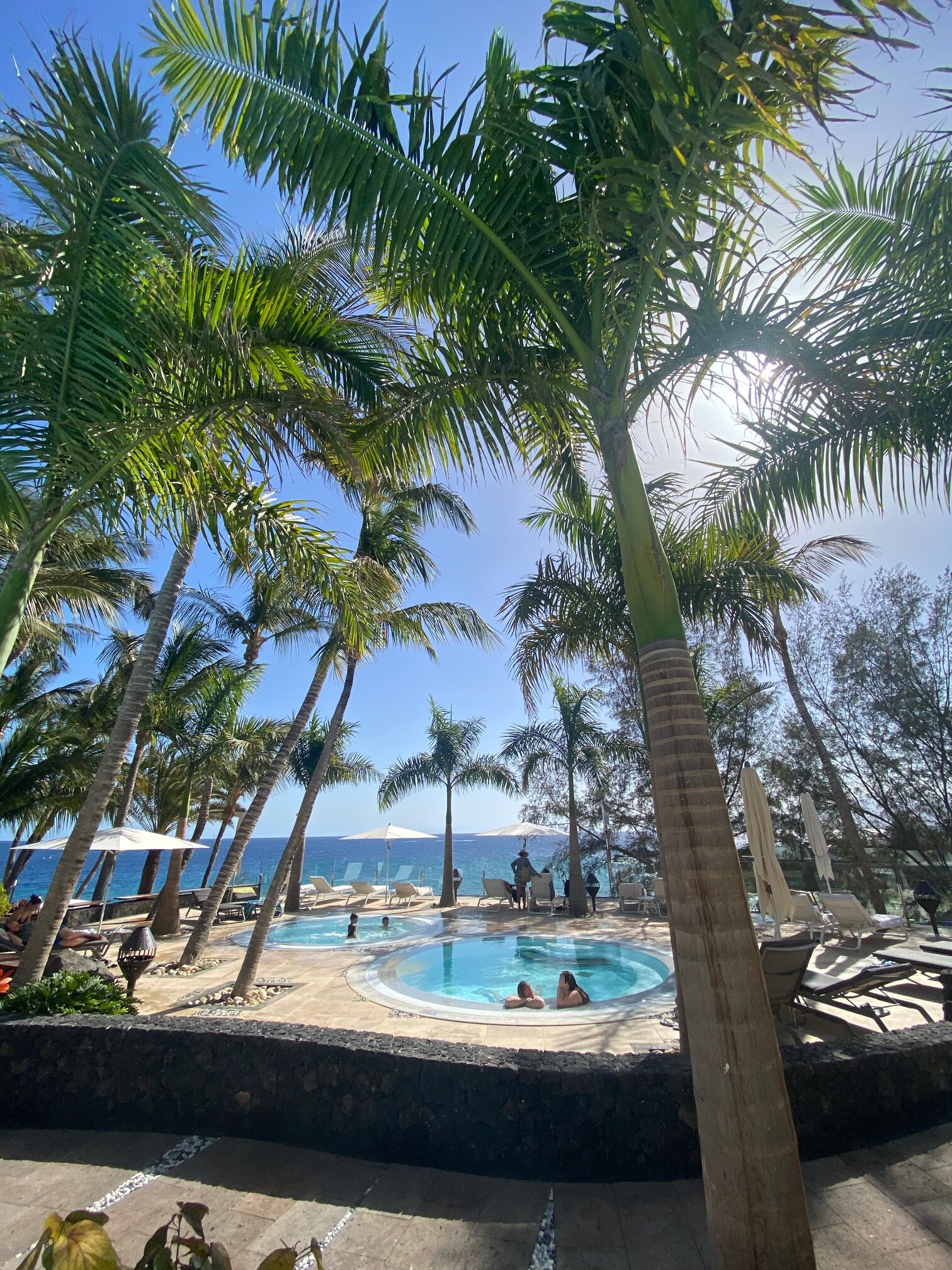 At the time of our visit there was a lot of towels reserving sun beds from first thing. We headed down after breakfast and managed to find 2 single ones left in the main pool area which we moved together. There are plenty of hidden spots within the mature gardens with a variety of seating, so do take a good walk around to find your preferred area. Guests have gate access to both beaches of Playa Grande and Playa Fariones (Cala on the map), so it’s easy to swim in the sea. The two jacuzzis are situated together, below the infinity pool. Watching the sunrise from the jacuzzi before breakfast was a lovely start to the day. The main infinity pool has roman steps with a hand rail for easy access. Plus a stone shelf where you can just sit in shallow water or drop into the main pool. The pool shape is good if you like to have a proper swim, or like most, head over to the infinity side to gaze out to sea.
