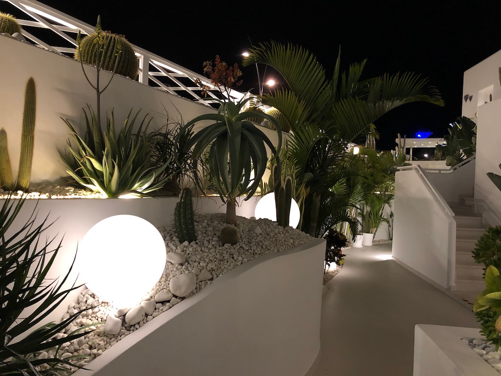 Our living space also had a direct ocean view, with a small terrace to the front, and a huge terrace to the side. The sofa had a foot stool, cushions and snuggly throws in front of another television. I was pleased to find a selection of organic teas, with teapot and kettle, as well as a Nespresso machine and pods for coffee. We had a fridge full of free soft drinks, together with a wine fridge, alcoholic miniatures and snacks which were very reasonably priced. The thing with Lani’s Suites is all those thoughtful extras, there were two hats and sunglasses, a beach bag, note pad and pen all of which we were encouraged to take home with us. We also made use of the binoculars for watching a pod of dolphins swim past the hotel. Lani’s Suites have embraced modern technology, you have a remote control to change the colour of your light cube, a tablet for internet browsing and contacting the hotel, private wifi access, a blue tooth speaker for playing your tunes etc. The bathroom had a walk rain head shower, a complete range of toiletries, scales and a hair dryer. The piece de resistance with this particular suite is the corner terrace, there were 2 sun loungers with a light cube, sofa, shower, table and chairs, plus our own jacuzzi. We could chose shade or sunshine with an umbrella or sliding awning, it was a heavenly place for a complete chill out.