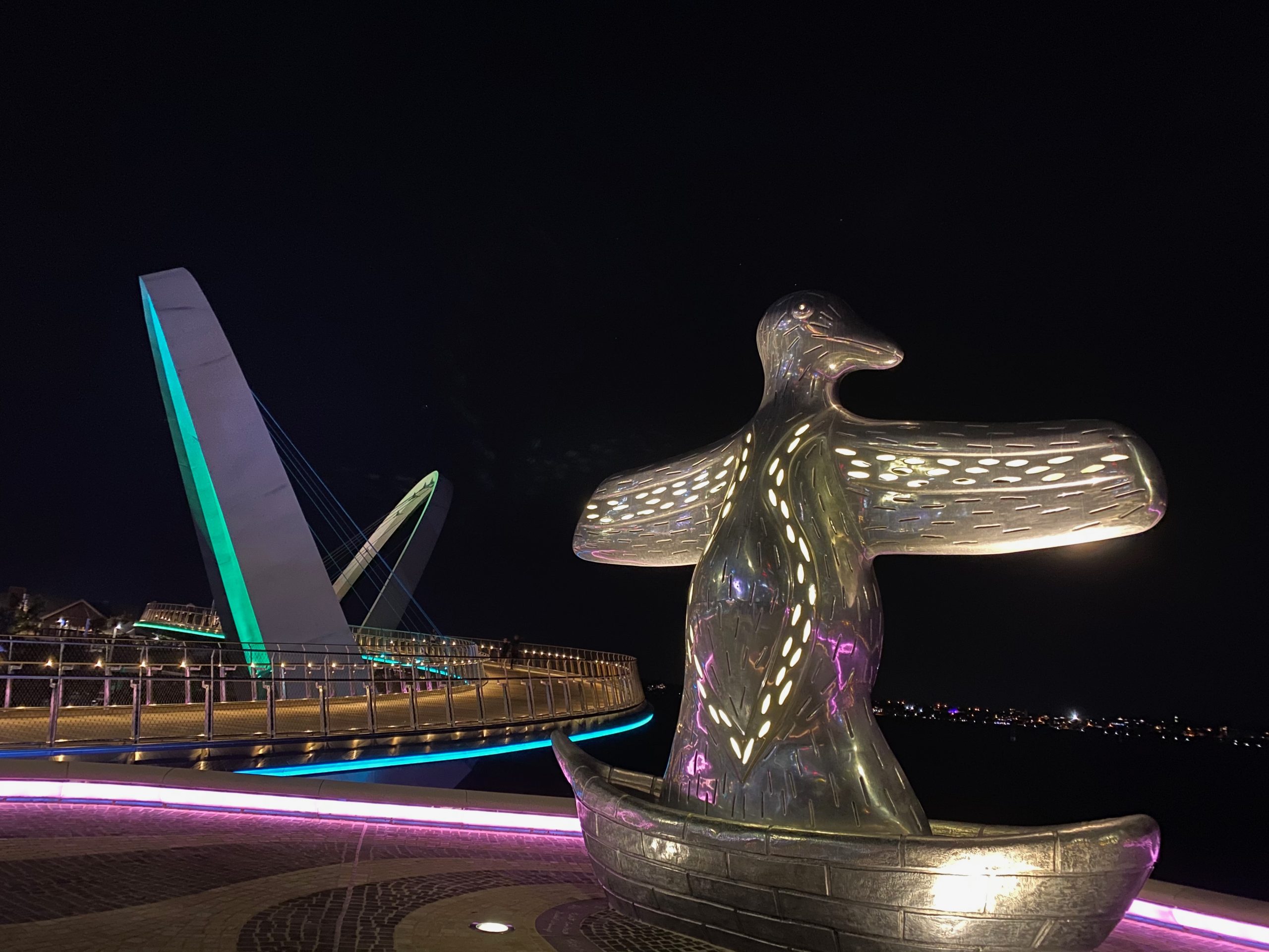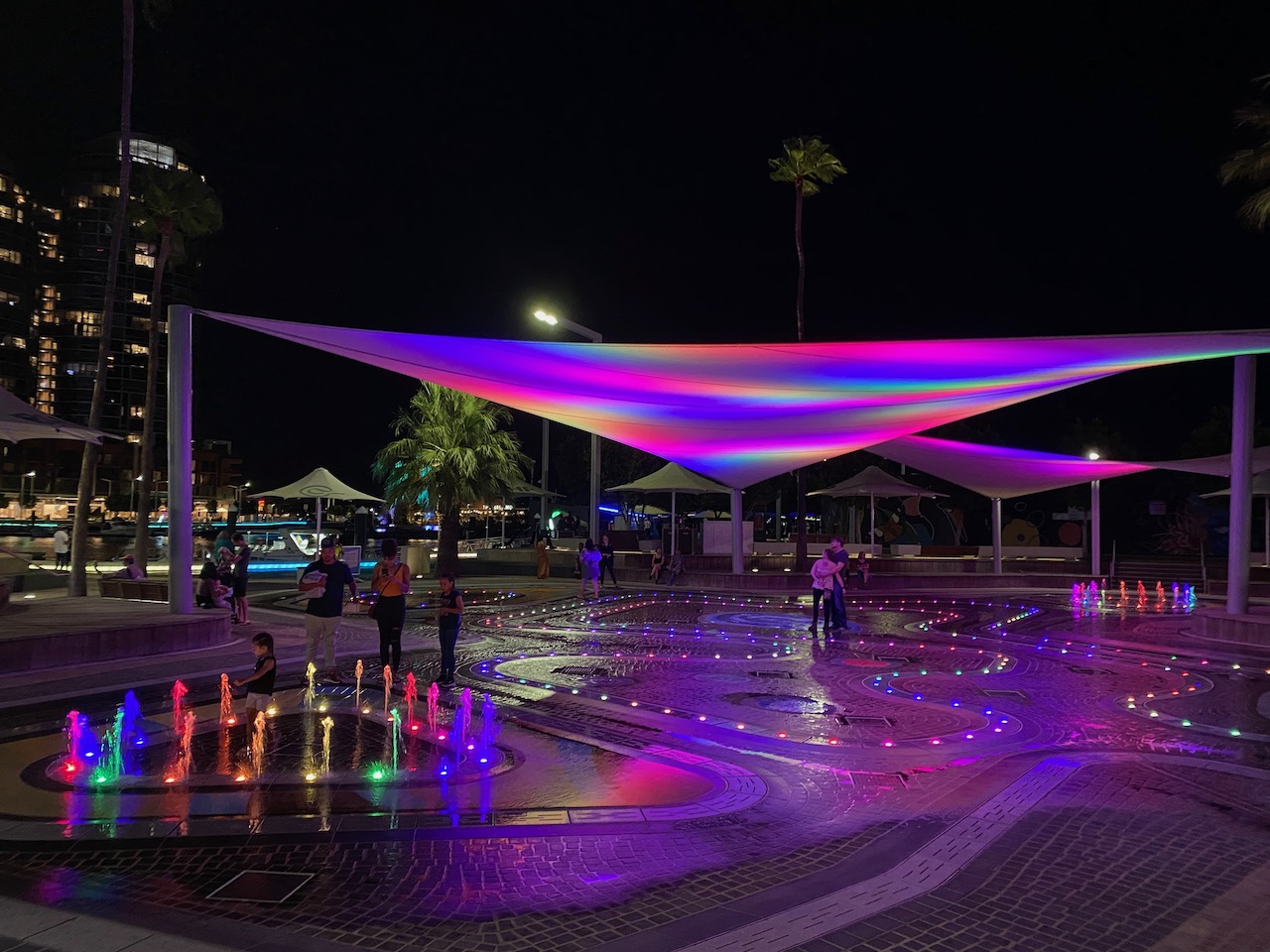 Elizabeth Quay is a lovely place for a stroll in the evening. The quayside is lit up with neon lights after sunset, including the rainbow coloured BHP Billiton Water Park.