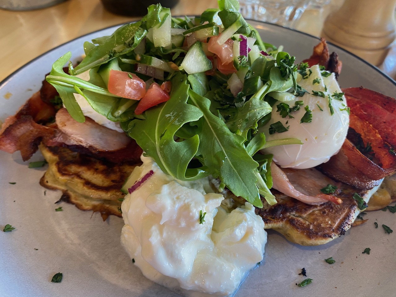 - Corn fritters with poached egg & bacon
