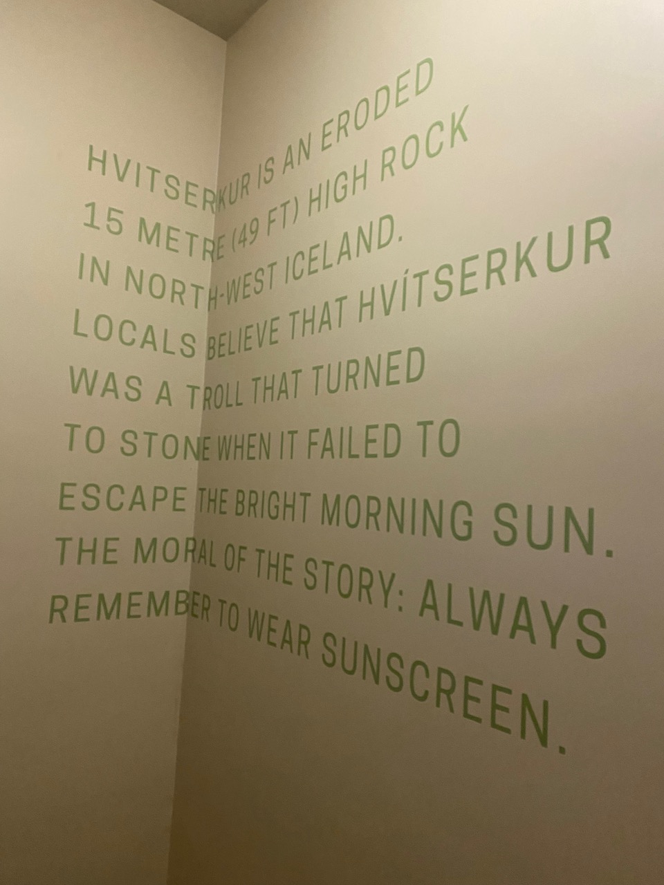 It was getting dark, with snow on the ground as we started the 50km drive to Reykjavik, it’s mainly one straight road (41) and right hand side of the road, so the same as home for us. Our Hotel, Klettur has free car parking underneath and there was space available on our arrival, you need a room key to access the garage. This hotel is modern with a quirky humour and clean.