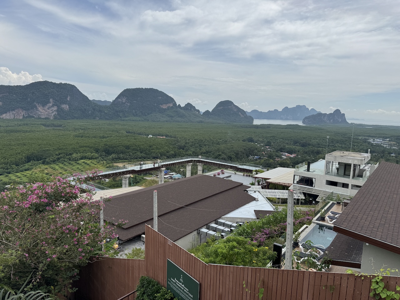 We were travelling from Phuket by hire car. Shortly after crossing the Sarasin Bridge we took an approx 14km detour off the route to Krabi. Our destination was the Bay View Cafe, however to reach this you need to park at the Sametnangshe Boutique Hotel and purchase a shuttle bus ticket for 150 baht per person. We boarded the next available shuttle and hung on tight! There’s 3 steep inclines to the stop, then a set of steps which takes you up to the cafe terrace and a breathtaking panoramic view.