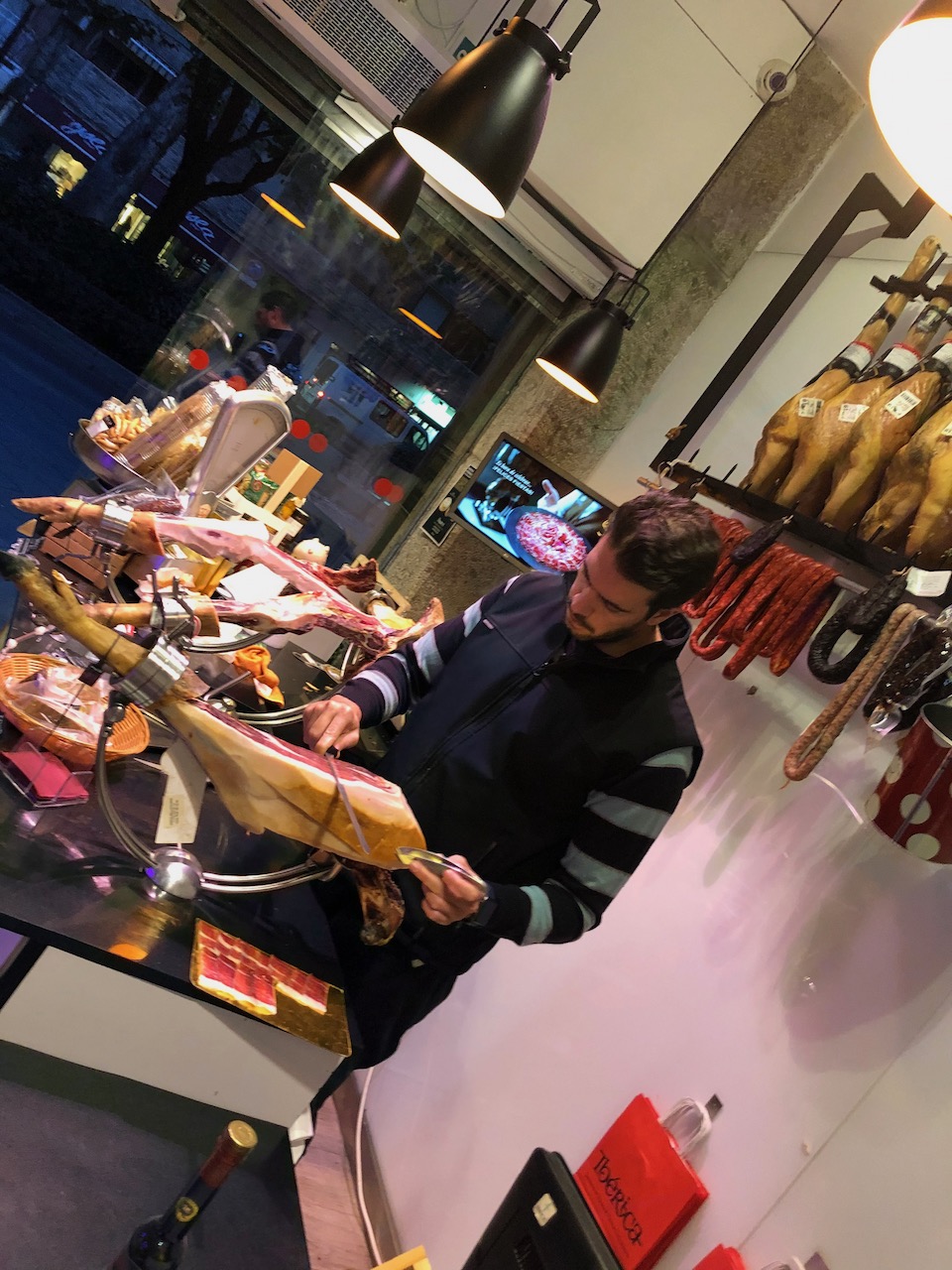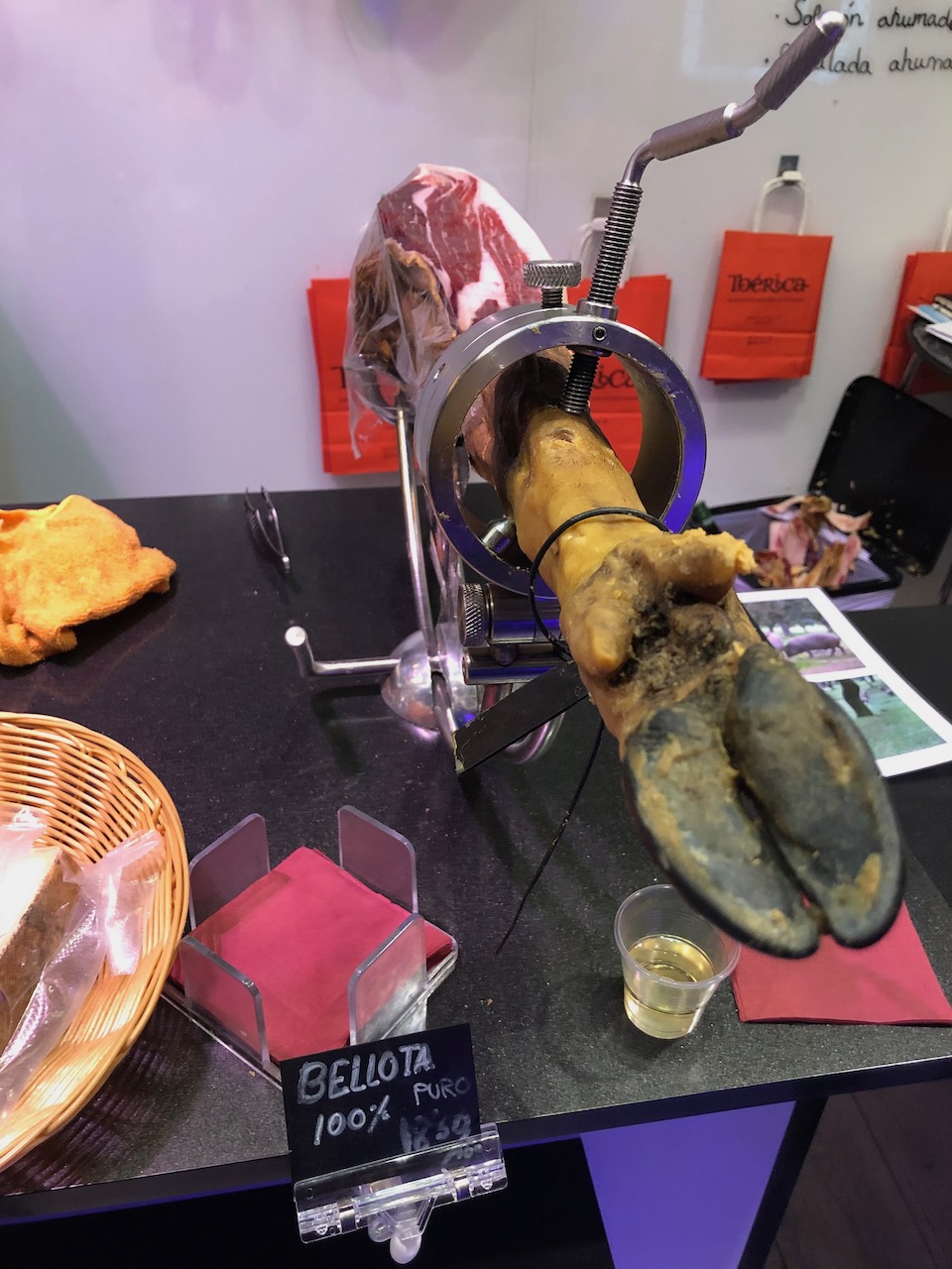 Our first experience was to taste and understand the difference between the types of Jamón Ibérico. The owner of Ibérica, Iván is a Jamón artisan and an expert in the art of slicing jamón. We tasted 3 different hams, the first a Jamón de Trevélez, produced from the white pig breeds of “Landrace”, “Large White” or Duroc-Jersey fed on a vegetable diet. The second was Jamón Ibérico de cebo de campo, these are a cross breed pig who spend some time in pasture and have a limited amount of acorns included in their diet. Then there is the ultimate, the Jamón Ibérico de Bellota, an Iberian black pig who spends their full time in pasture feeding on grass and acorns.