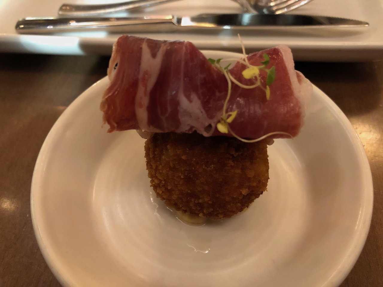 The twist with the Salmorejo was a sweetness from mango, served with avocado and a roll of ham. Our second dish at this location was a croquette. The impressively crispy exterior gave way to an intensely rich beef flavoured creamy filling, created from bull’s tail (Rabo de Toro).