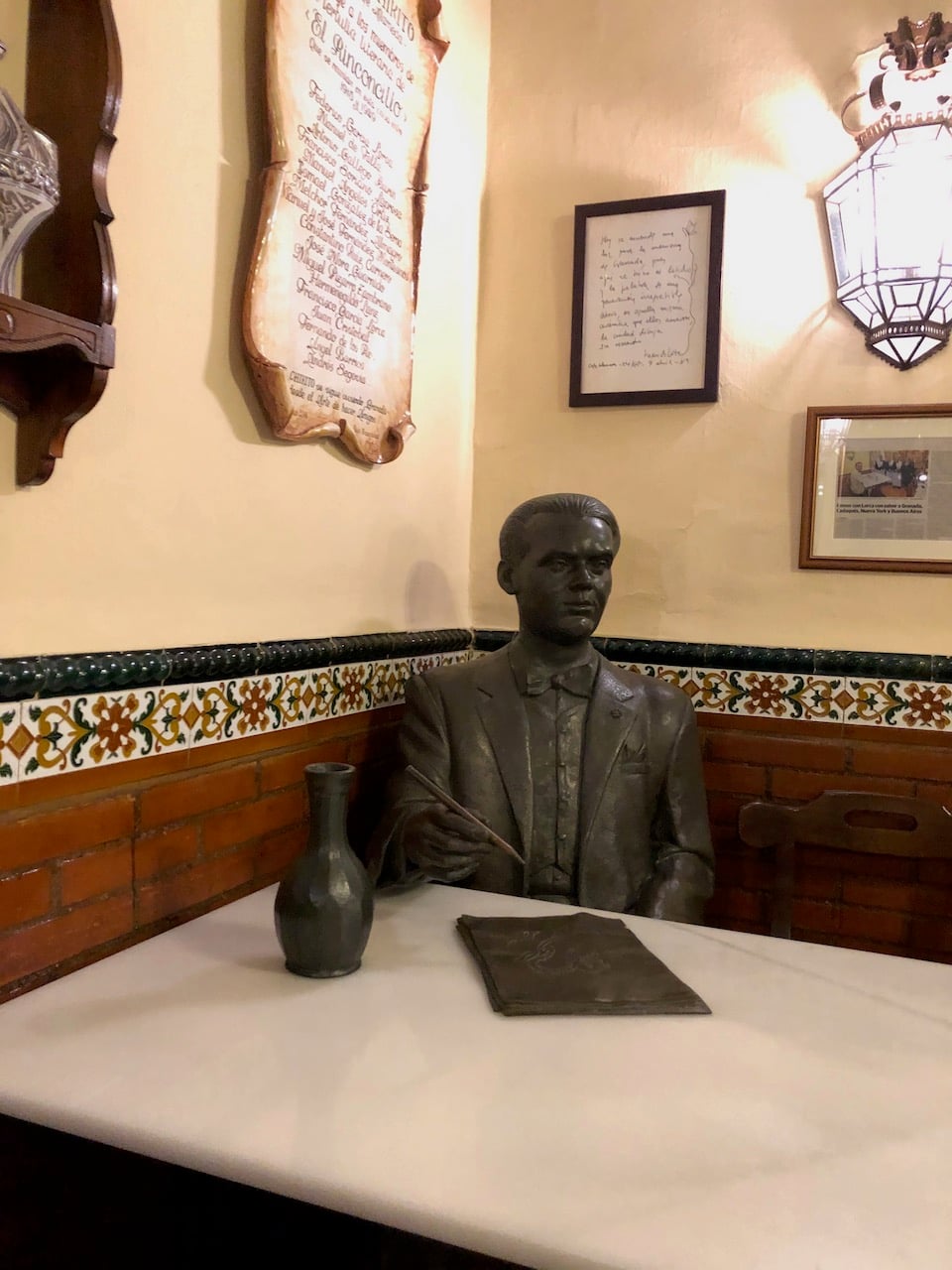 Our final tasting was paired with a red wine, Crianza Prado Negro from Bodegas Fontedei. This award winning tinto is a combination of 3 grape varieties: Tempranillo, Cabernet Sauvignon & Merlot then aged for 11 months in French oak barrels. You can’t help but notice the table in the back corner dedicated to Spanish poet, playwright, and theatre director, García Lorca.