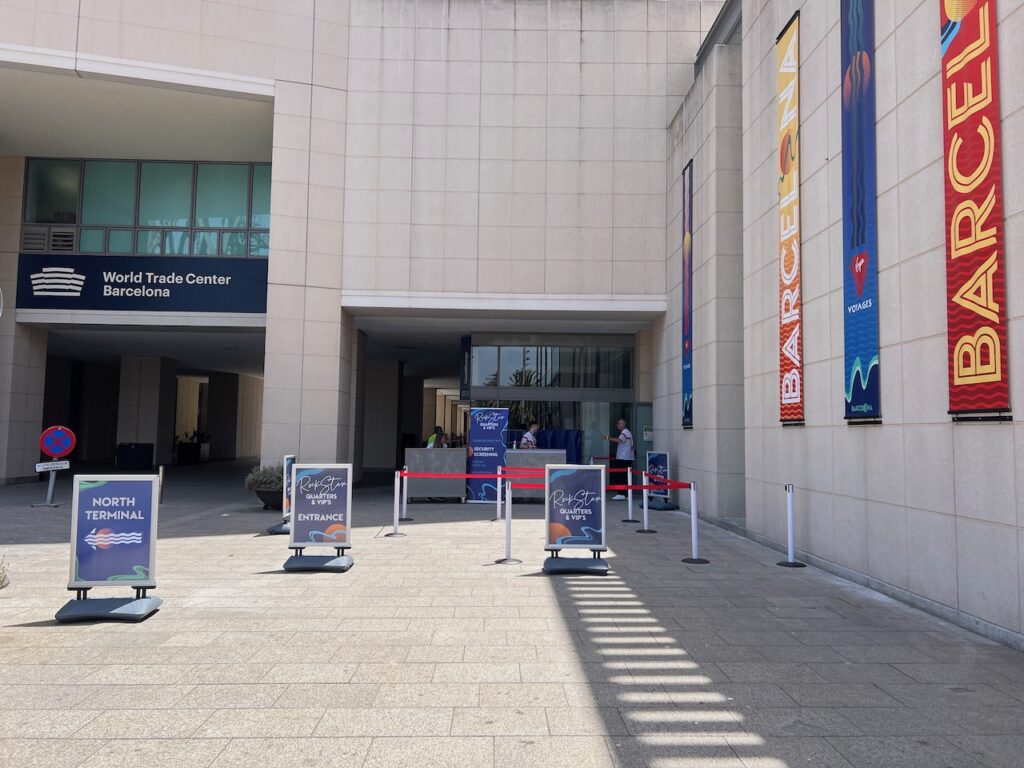 Armed with our Covid vaccination documents and negative Covid test result, we arrived at the Valiant Lady for our embarkation time of 14:00. She docks at the World Trade Centre in Barcelona, which is a much more convenient location that the usual cruise port. The process was to drop off your luggage, then join the boarding queue for your allotted time. For us RockStars there was a separate desk, set back on the left and no-one ahead of us, so we went straight through to the boarding desks inside. Here, we were issued with our sailor wrist bands and any outstanding paperwork checked before proceeding to the ship.